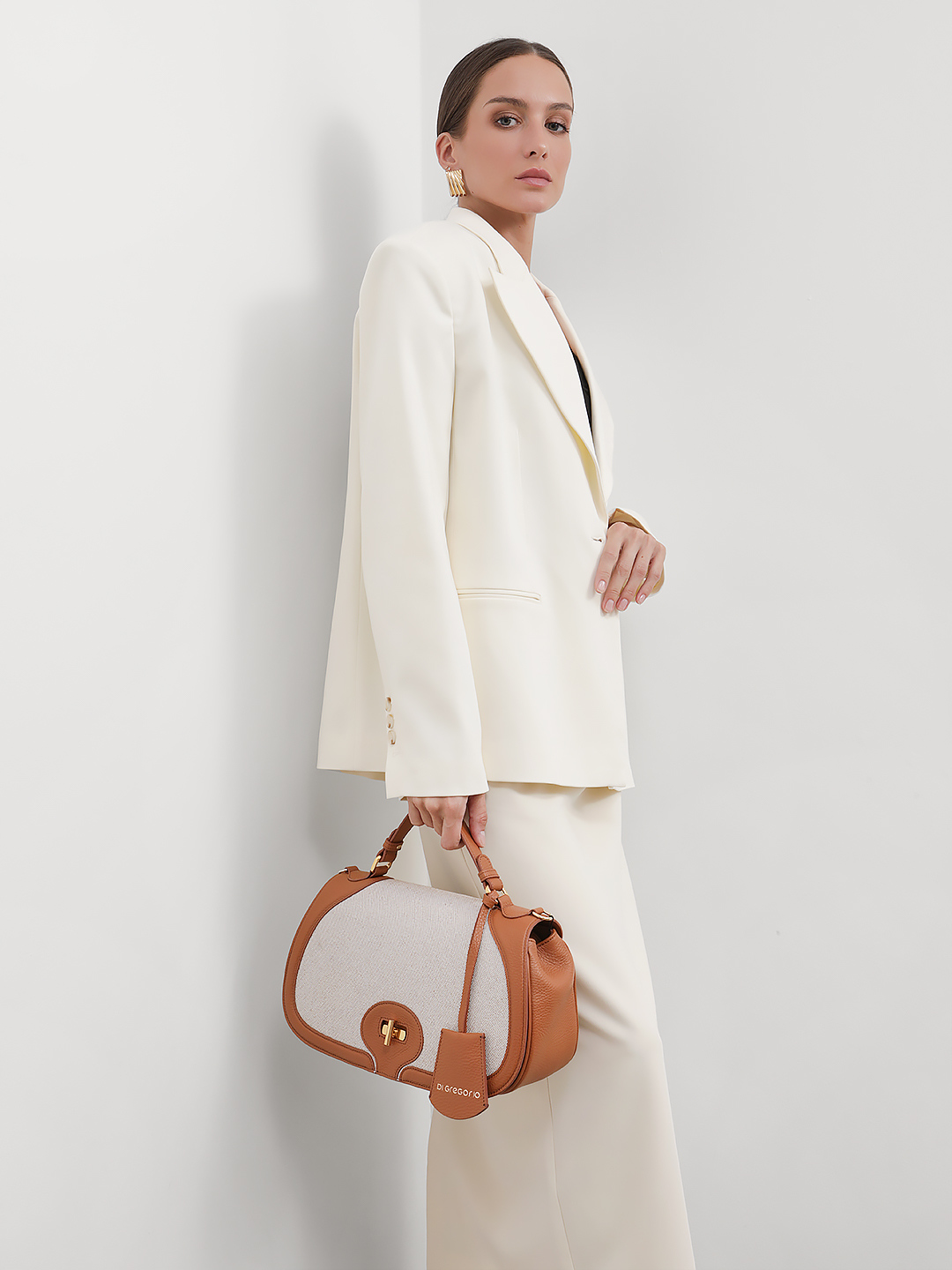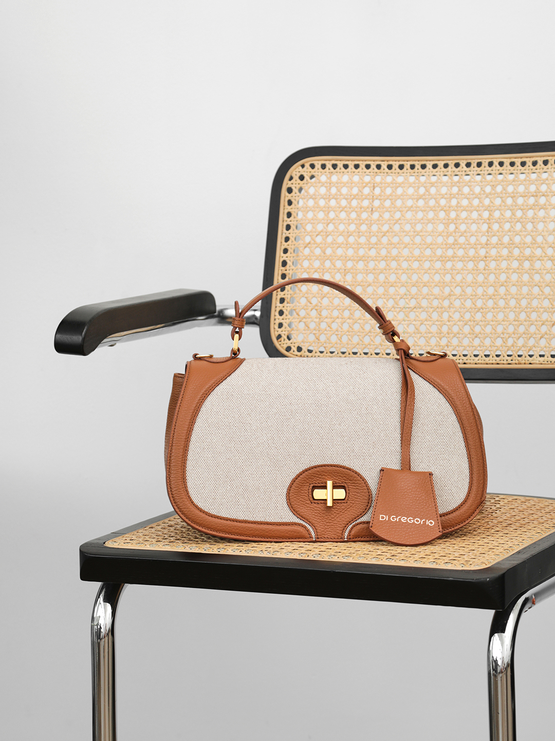 Сэтчел с вставками из натурального льна с золотистой фурнитурой от Di Gregorio в рыжем оттенке
