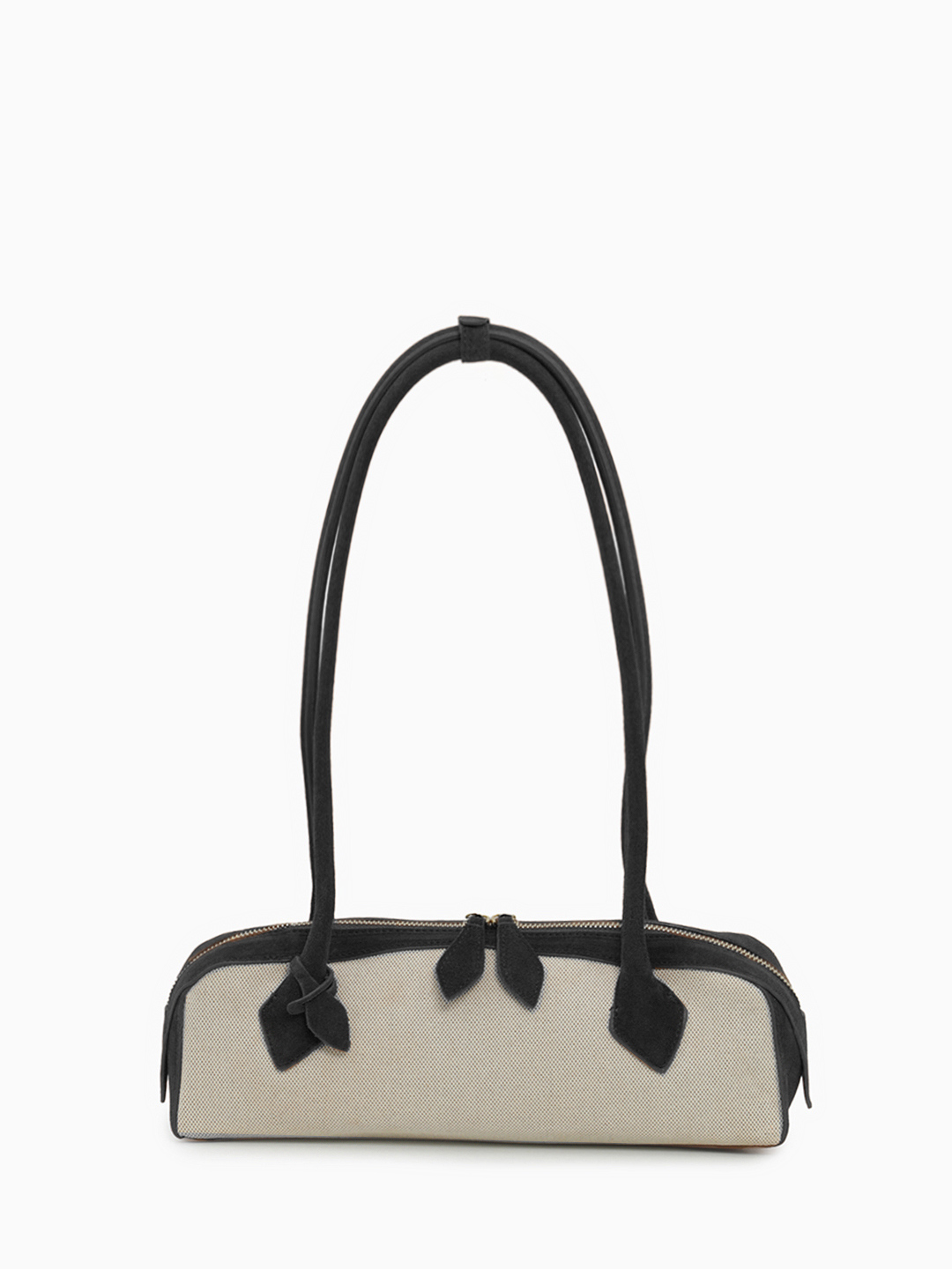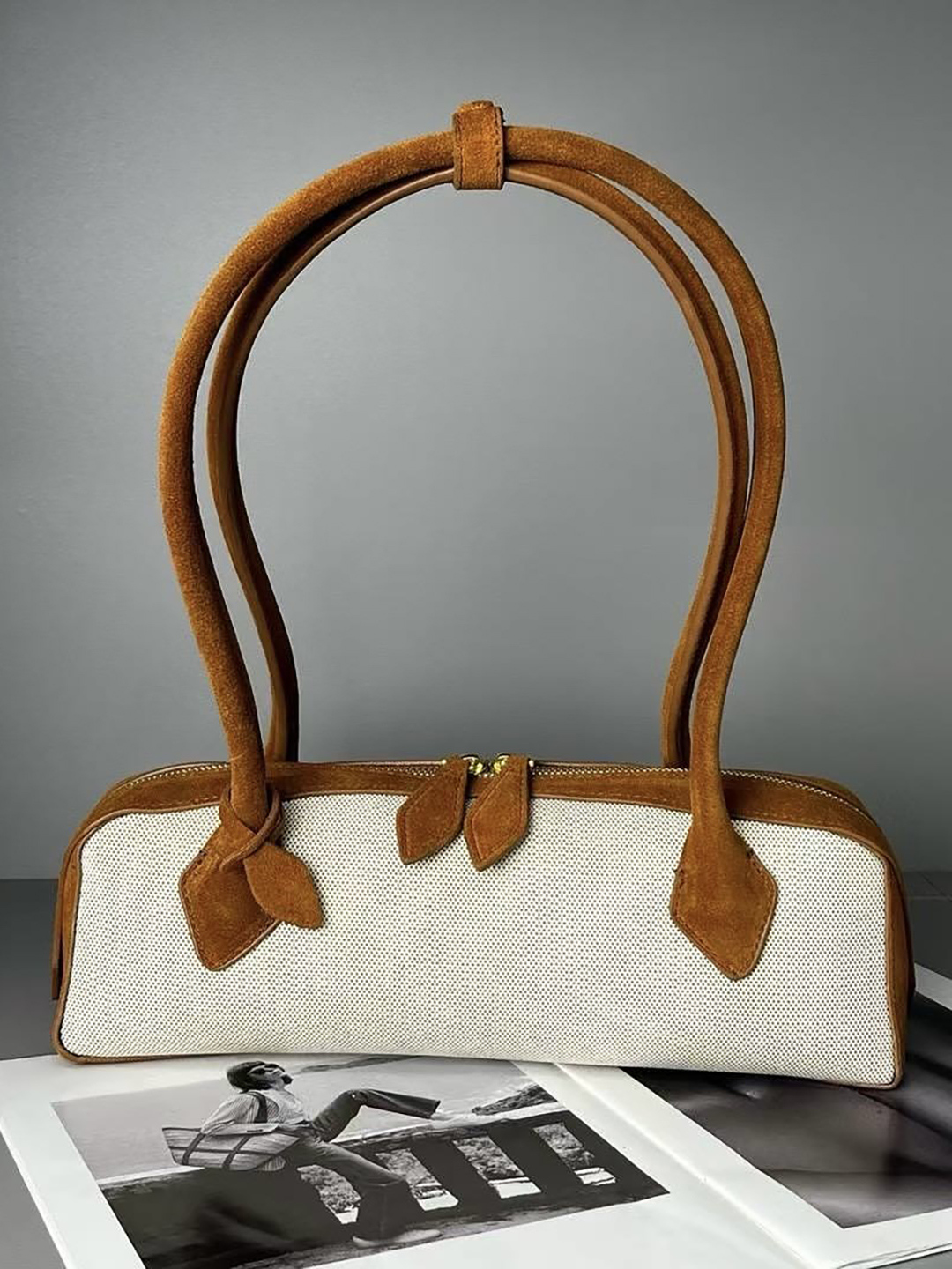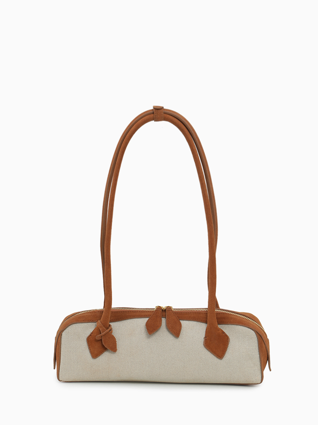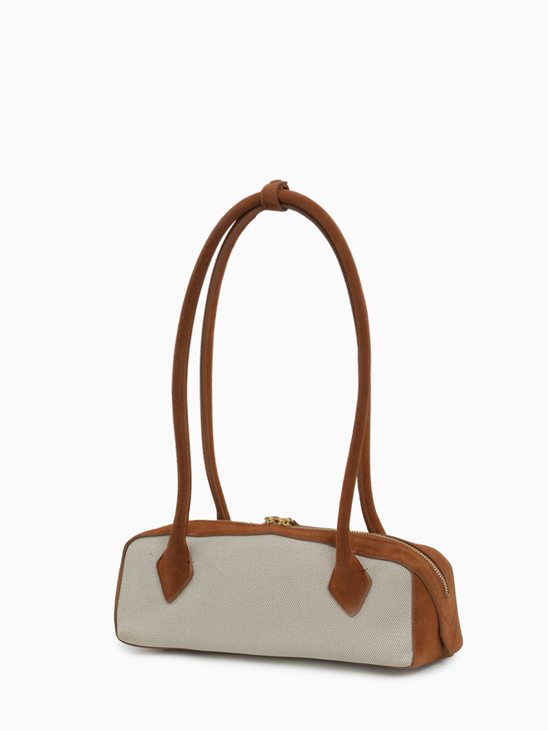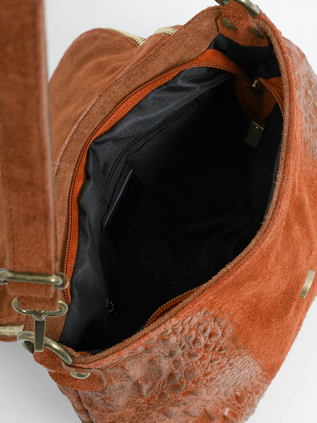 Сумка-багет с двумя длинными ручками от IVORY в сочетании ткани под лён и замши рыжего оттенка