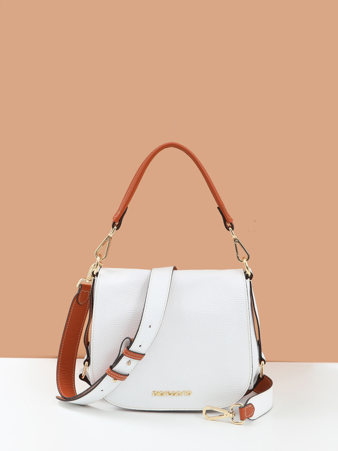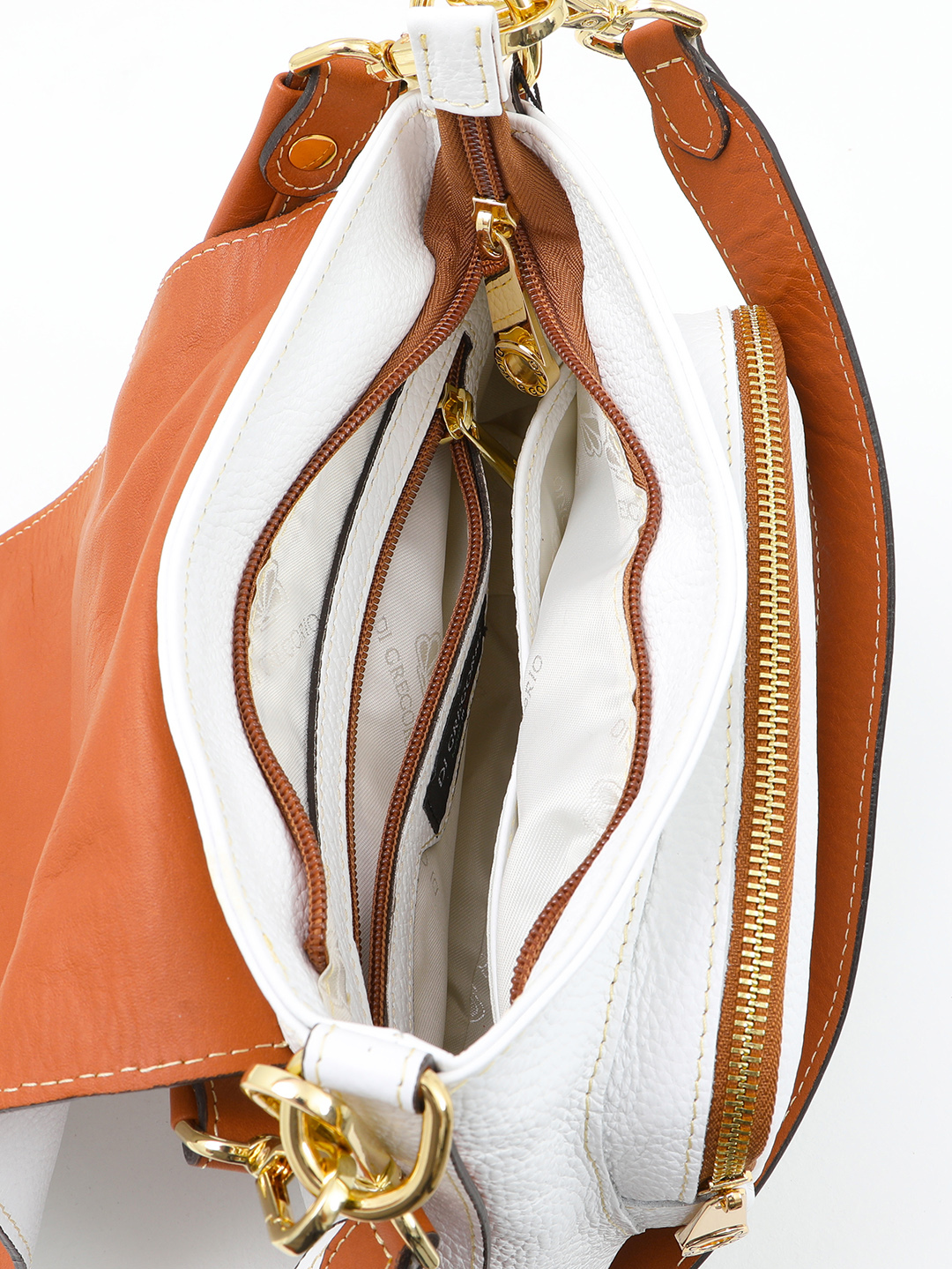 Полукруглая кросс-боди с длинным ремнем от Di Gregorio в белом цвете с рыжей отделкой
