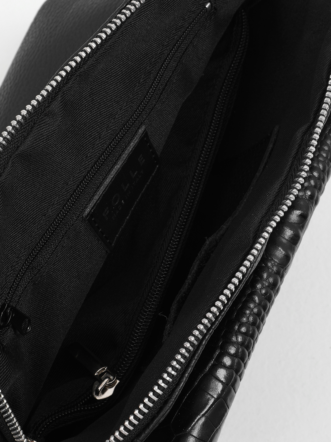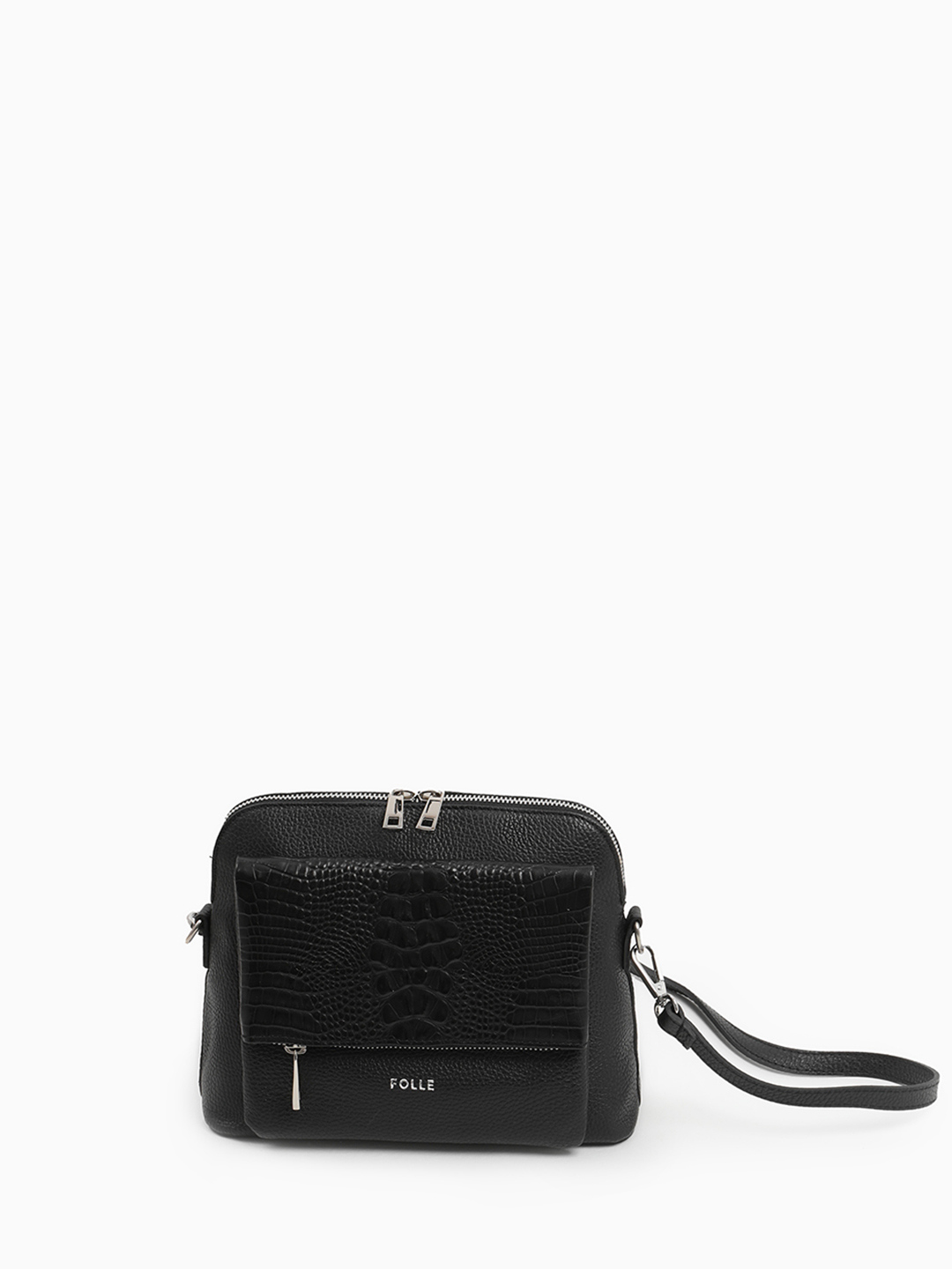 Чёрная кросс-боди с тиснением под крокодила на внешнем кармане от FOLLE