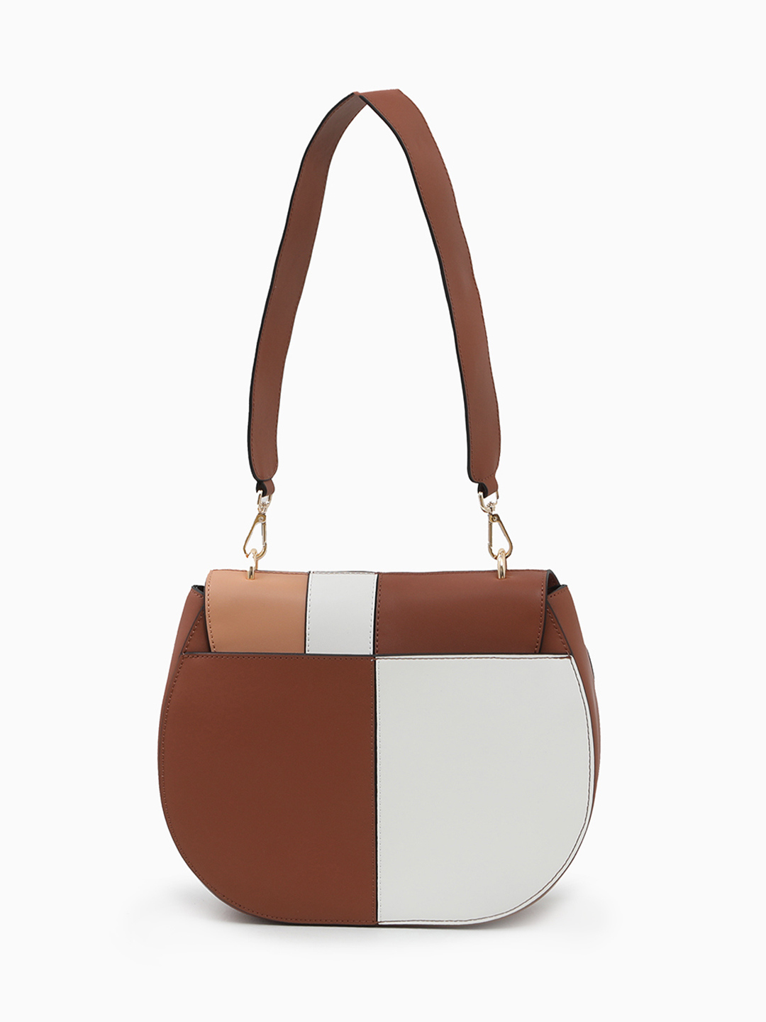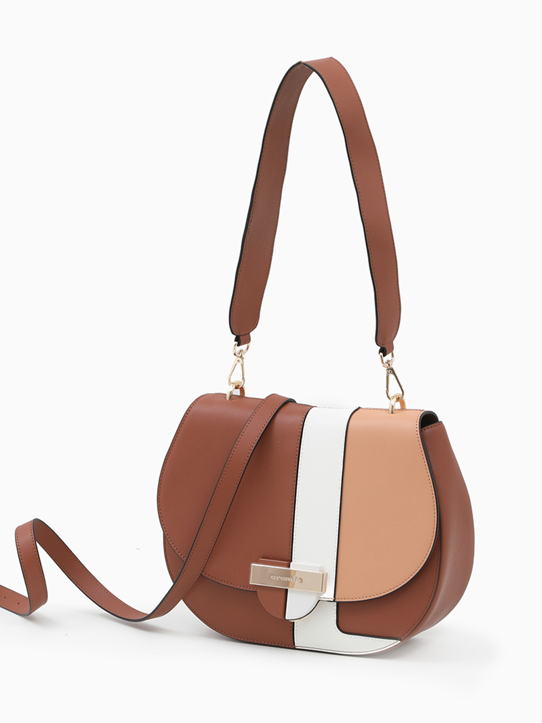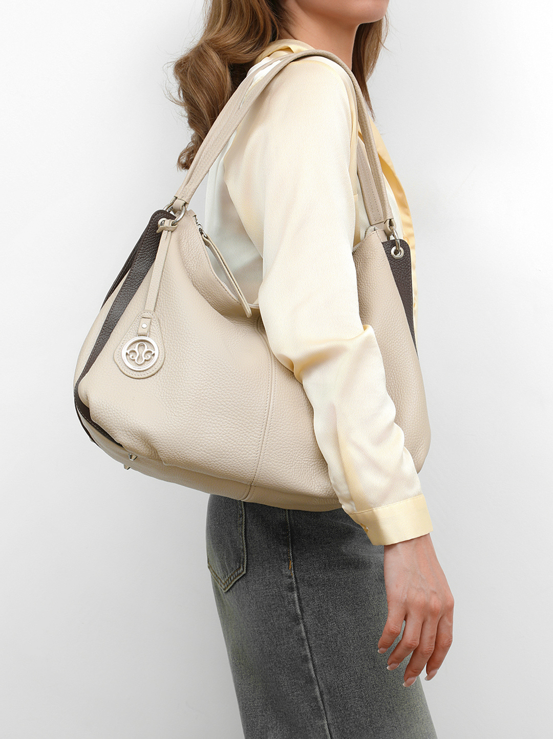 Бежевая сумка-хобо с фирменным брелоком и контрастными вставками от FOLLE
