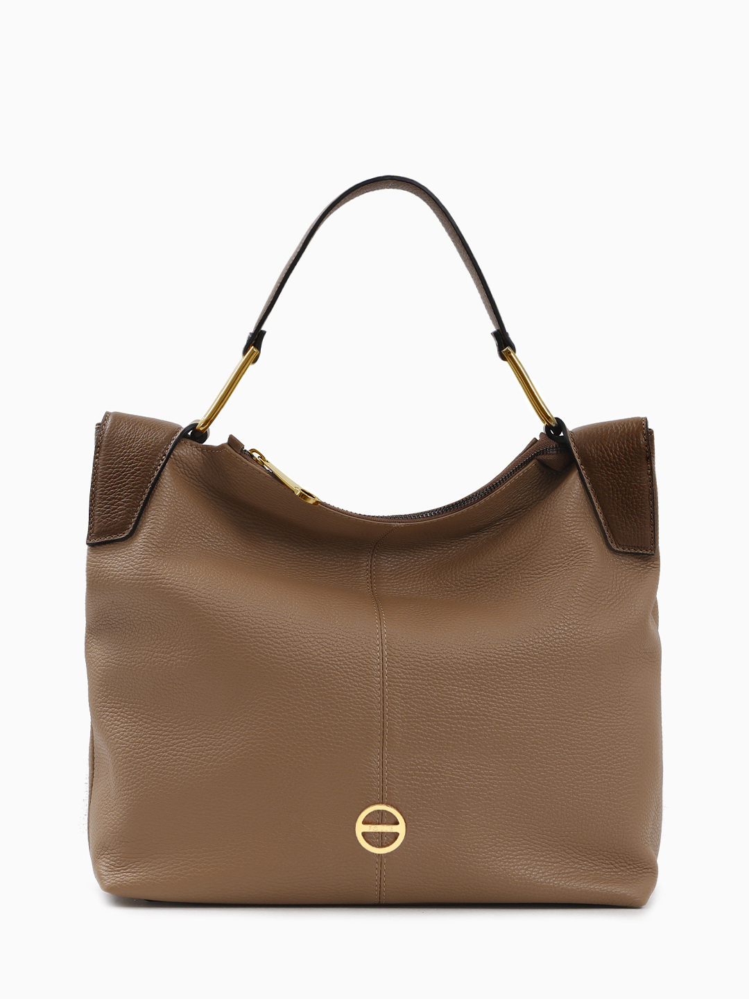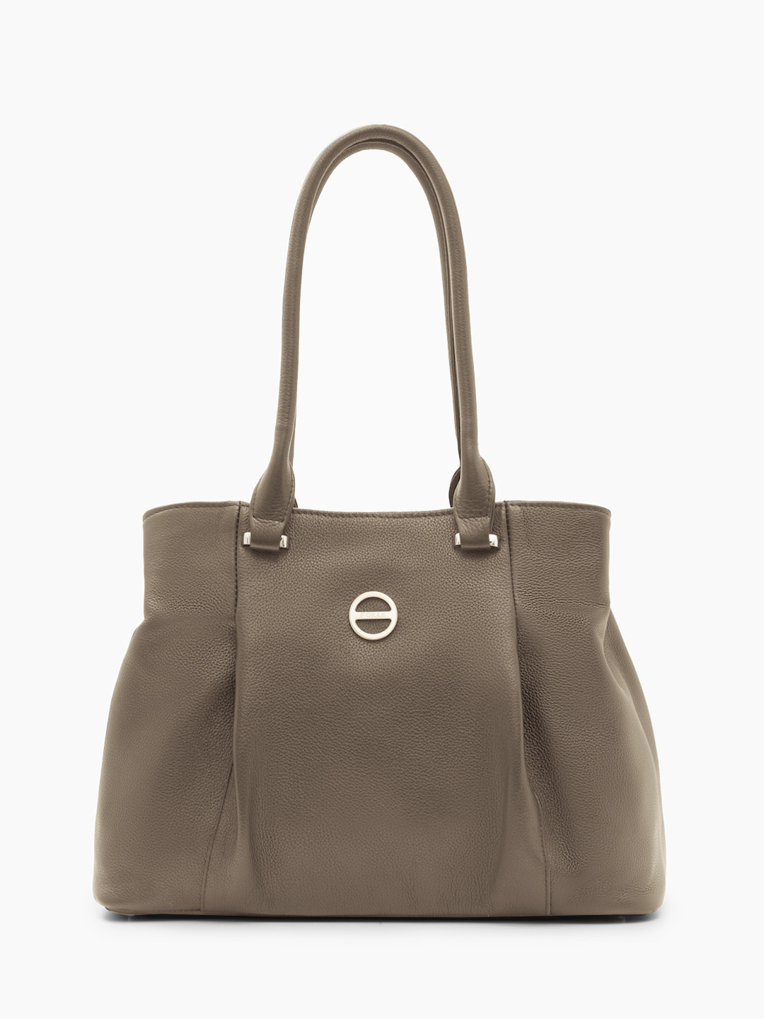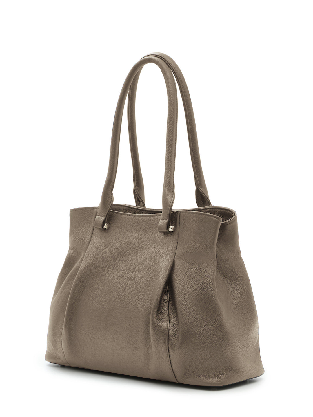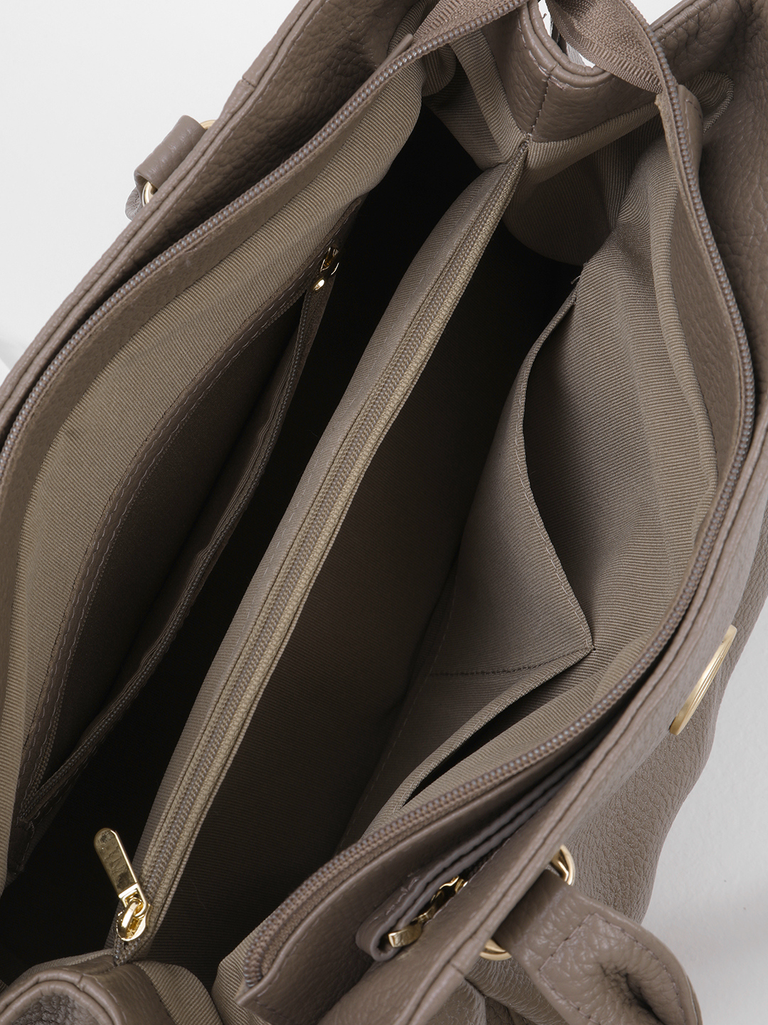 Сумка-тоут с драпированными складками и круглой фурнитурой от FOLLE оттенка тауп