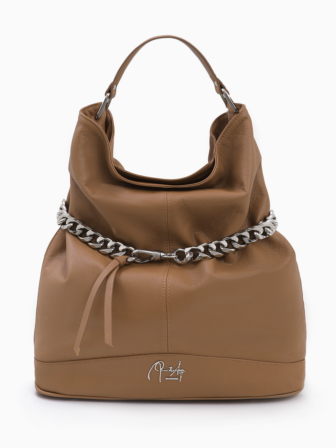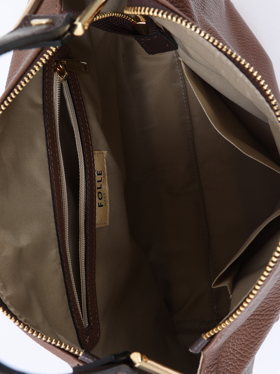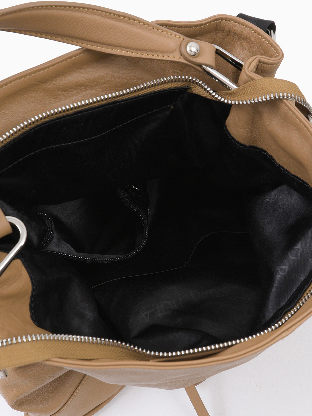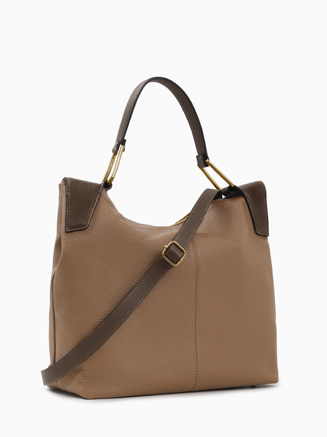 Сумка-тоут с драпированными складками и круглой фурнитурой от FOLLE оттенка тауп