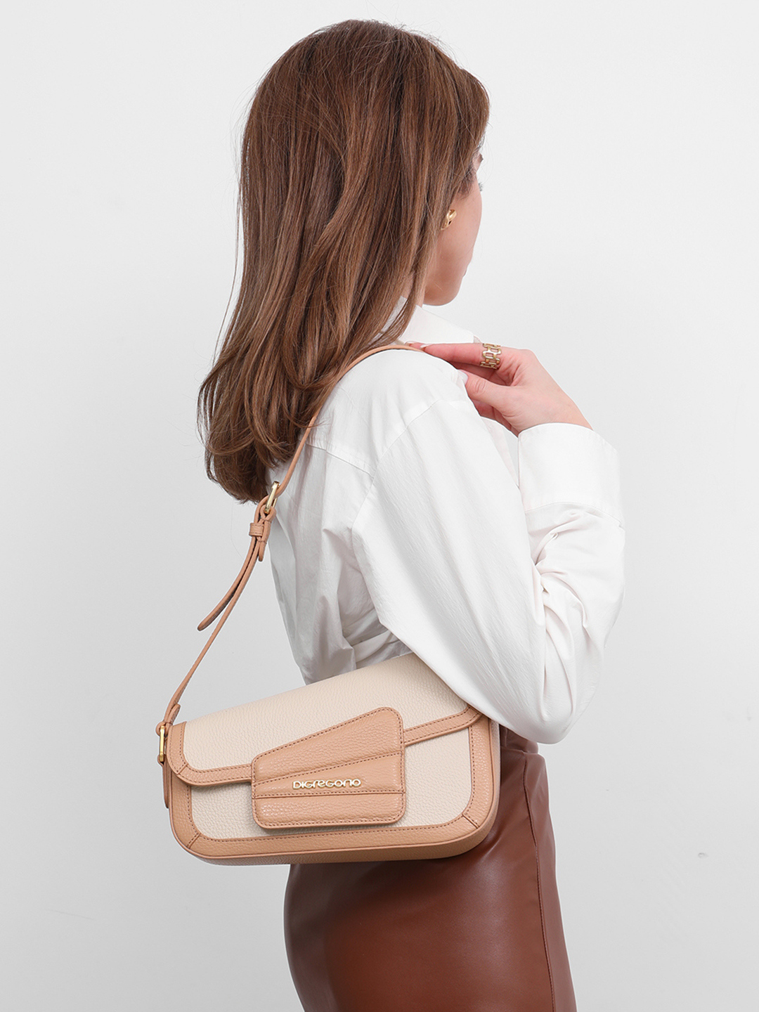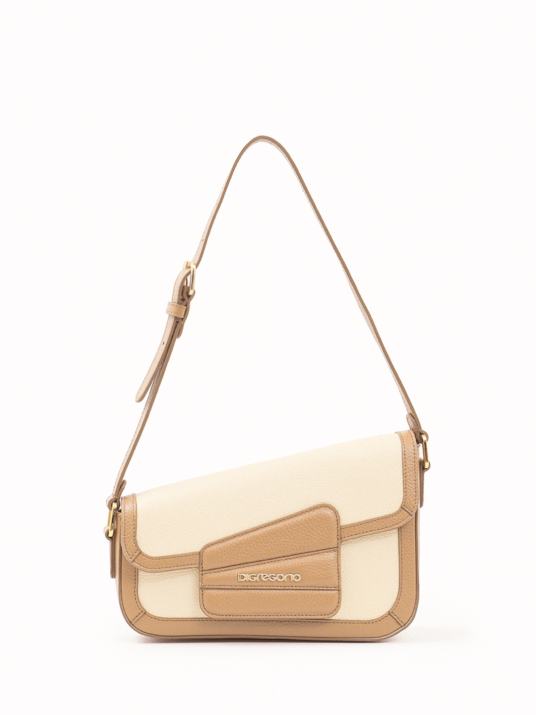 Ассиметричная сумка-багет с длинным плечевым ремнём от Di Gregorio в сочетании коричневого цвета и оттенка латте
