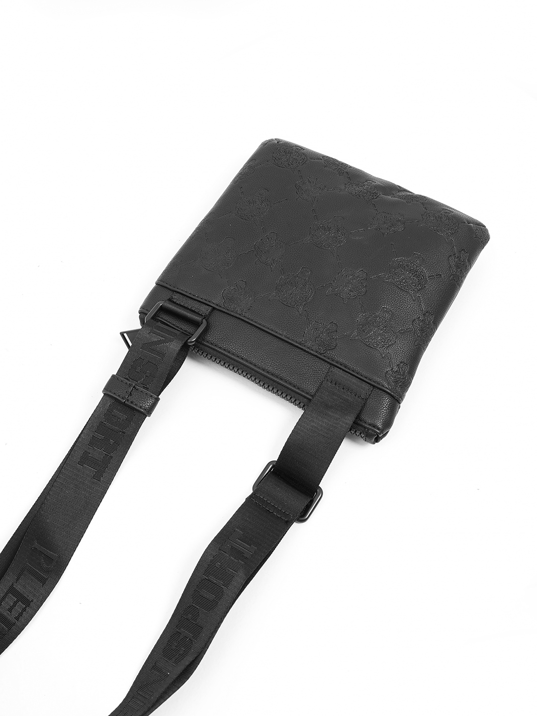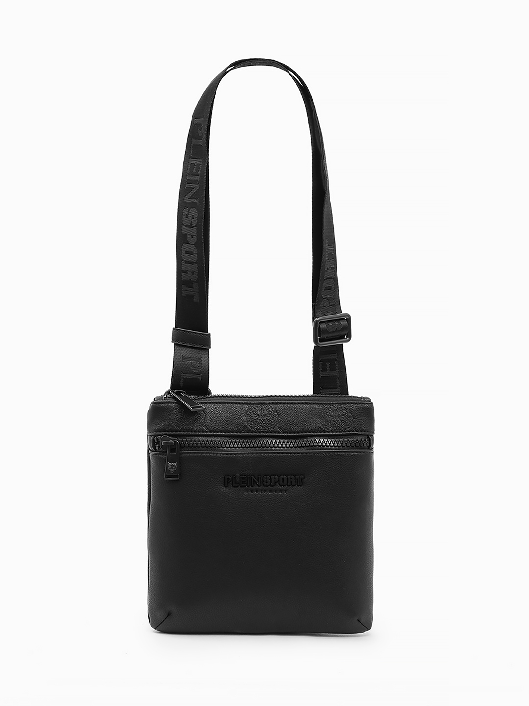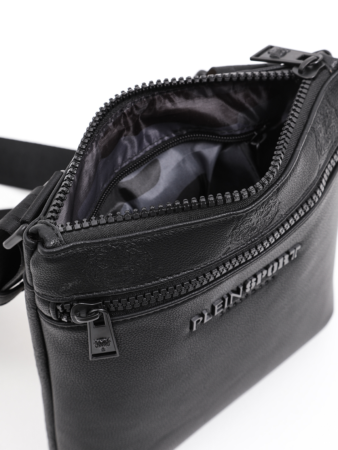 Мужская сумка-планшет на плечо с выбитым фирменным принтом в виде тигра и широким текстильным именным ремнём от PLEIN Sport в чёрном оттенке
