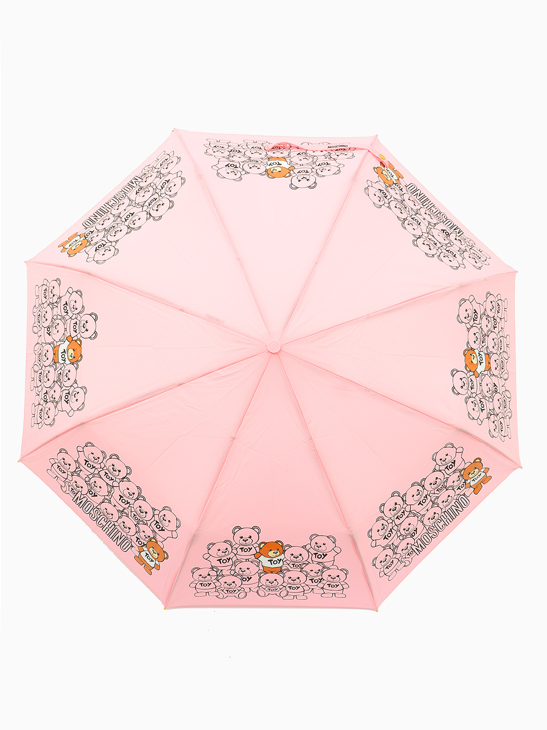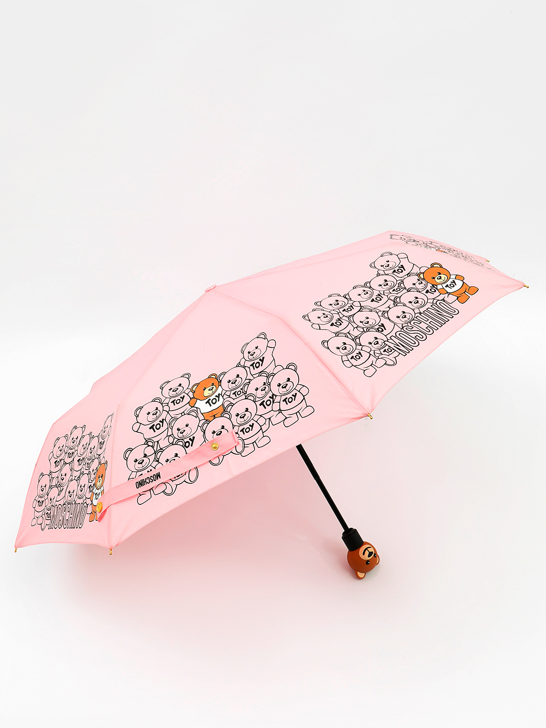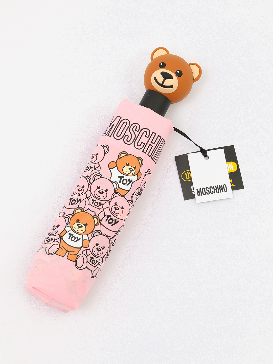 Розовый зонт-автомат mini с фирменным принтом MOSCHINO и фигурной ручкой в форме головы мишки Тедди