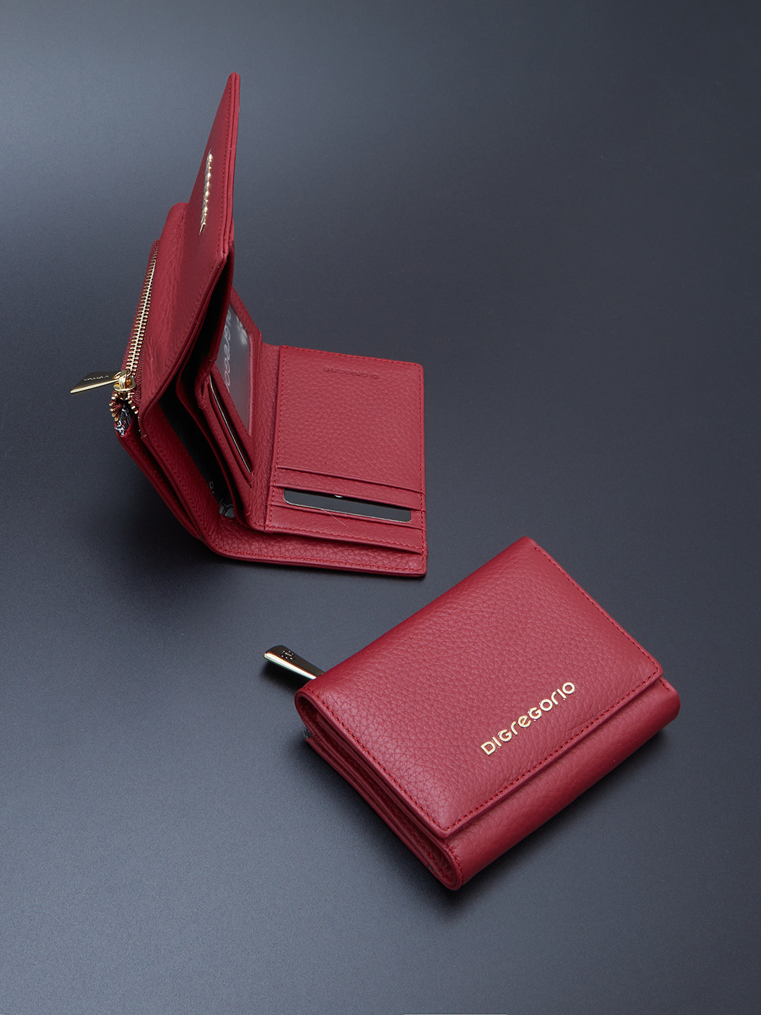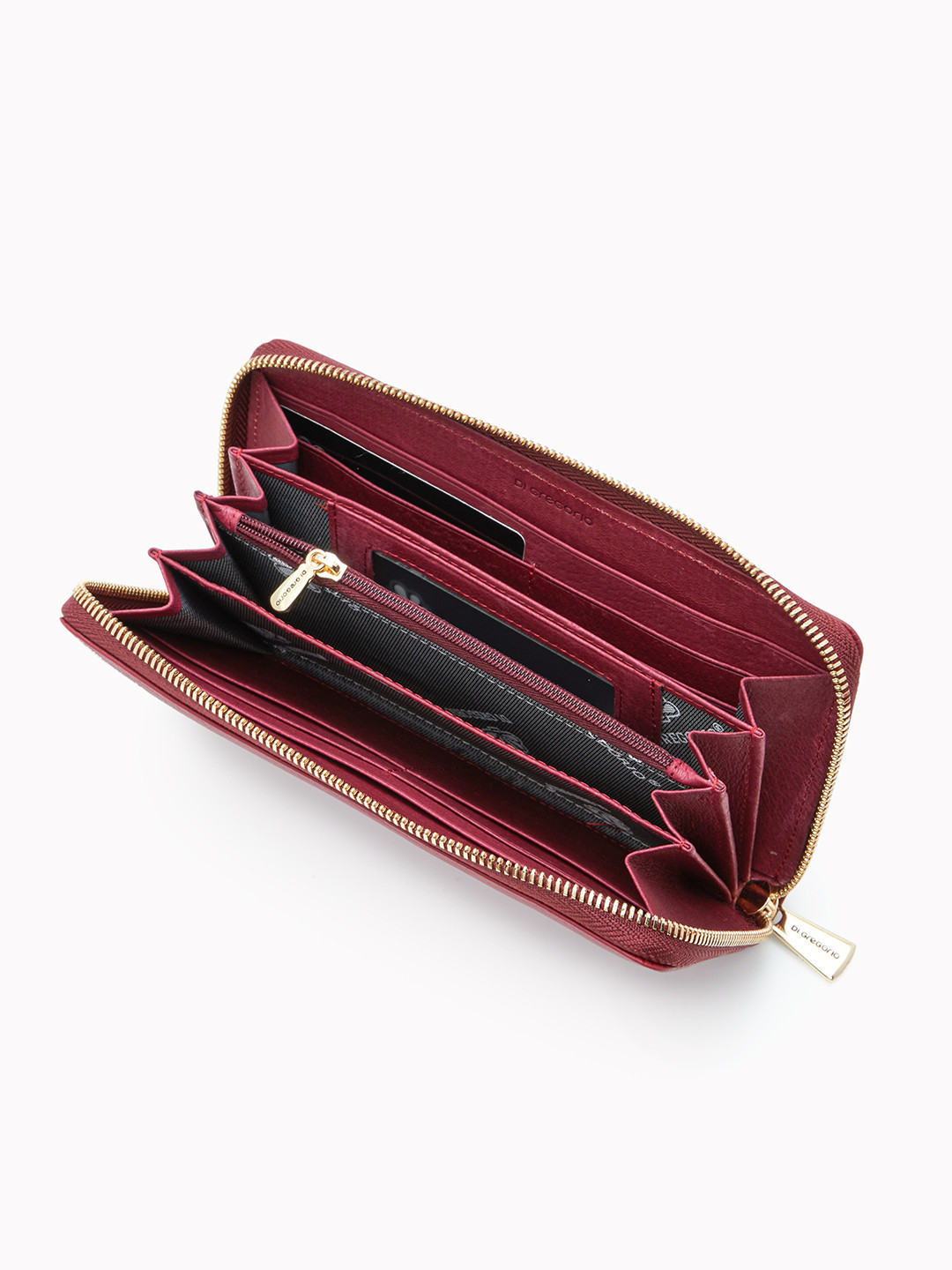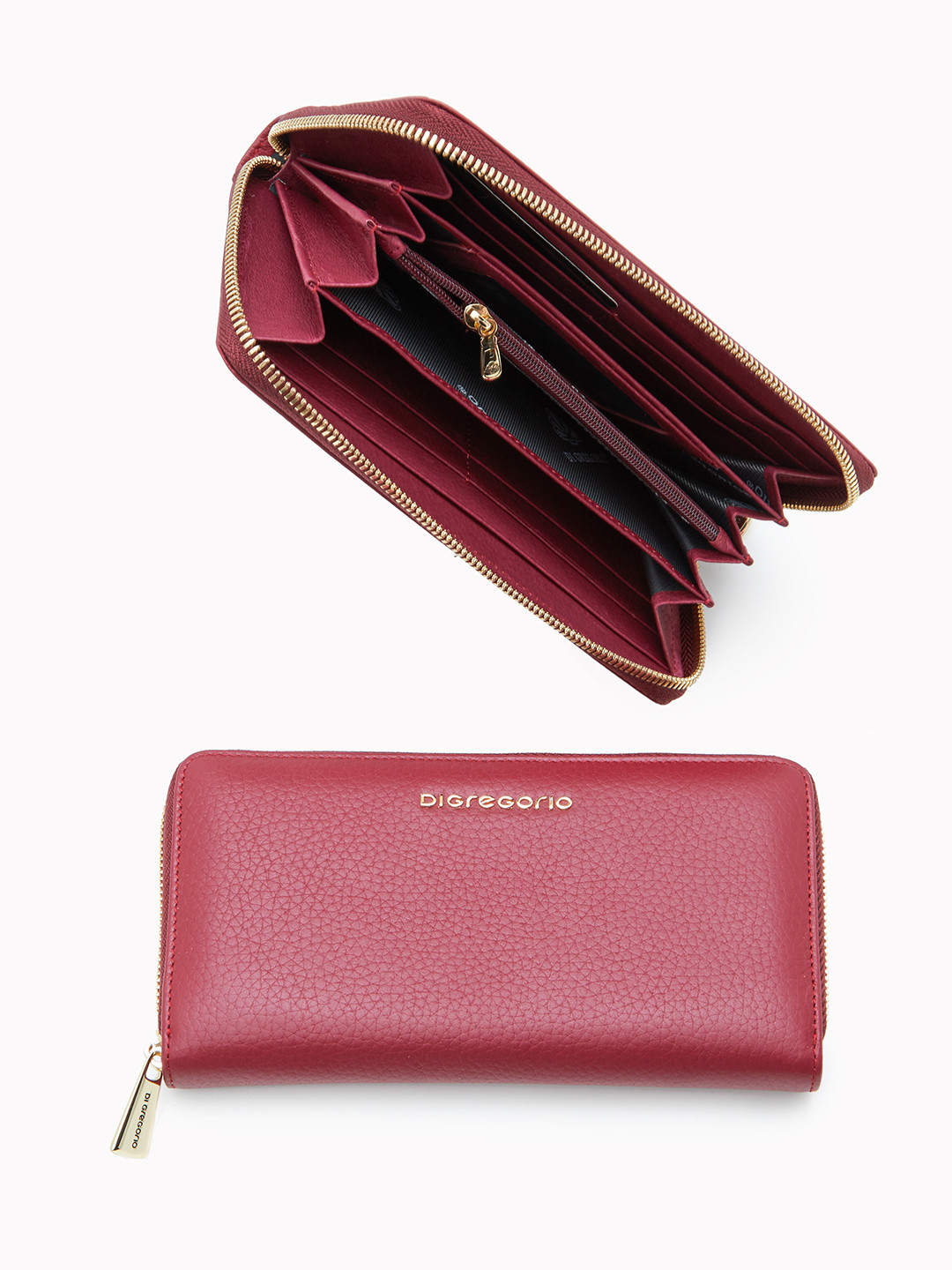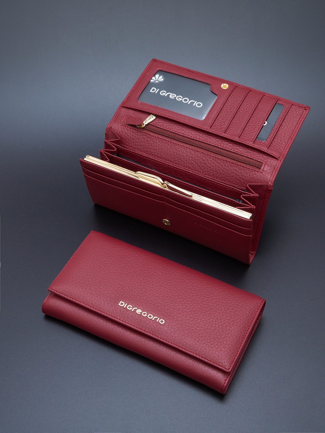 Миниатюрный кошелёк с золотистой фурнитурой и логотипом Di Gregorio из кожи бордового цвета