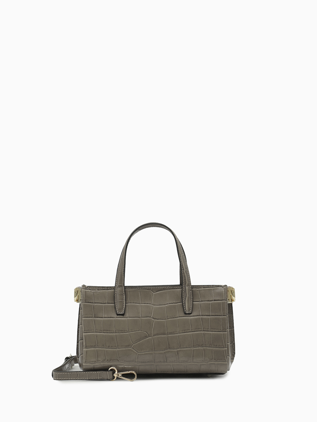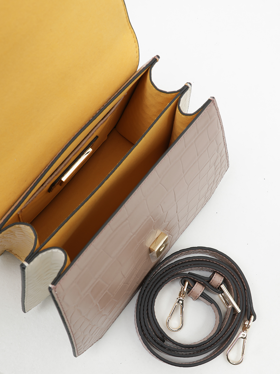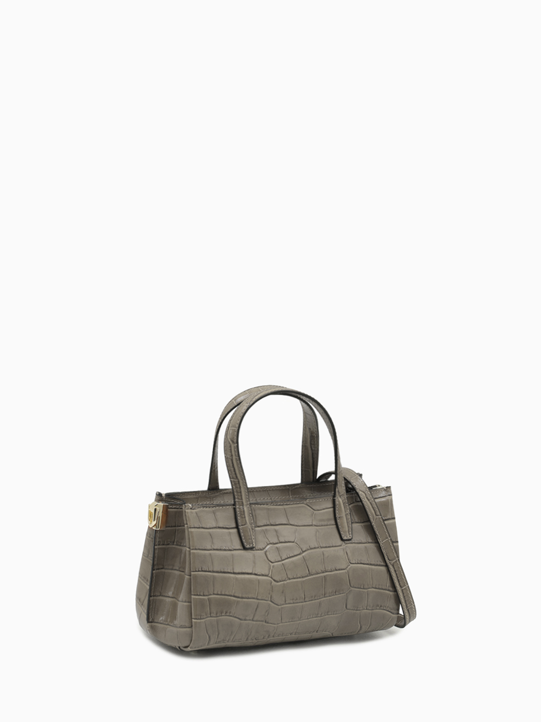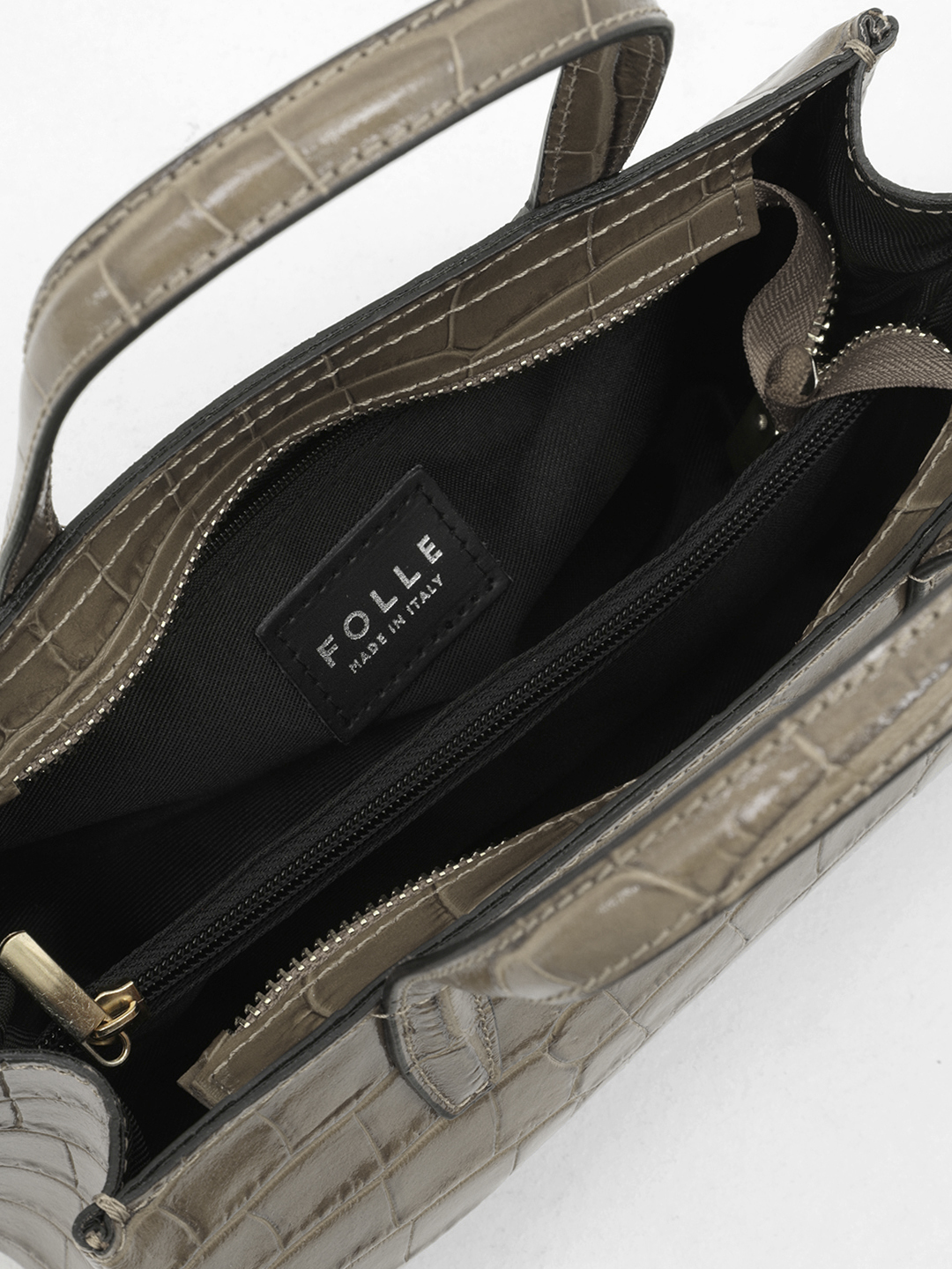 Небольшая сумка тоут через плечо от итальянского бренда FOLLE из кожи с выделкой под крокодила оттенка тауп