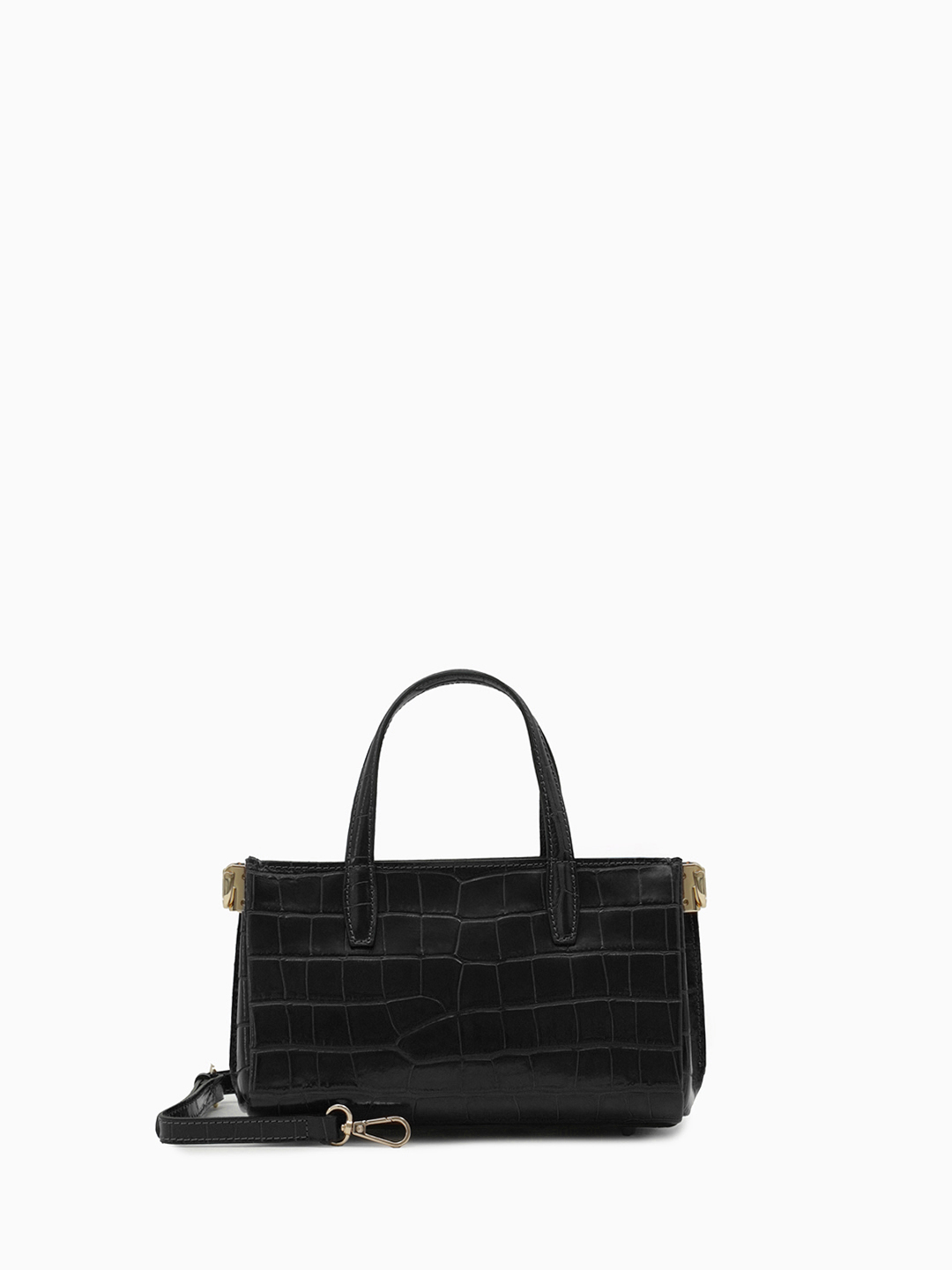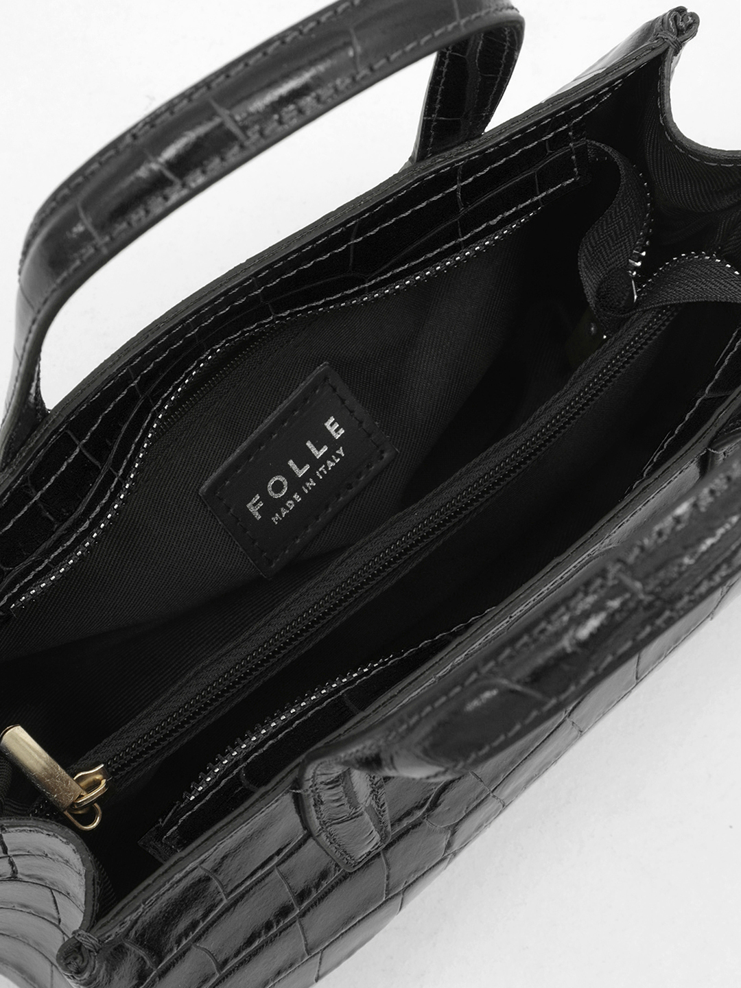 Небольшая сумка тоут через плечо от итальянского бренда FOLLE из черной натуральной кожи с выделкой под крокодила