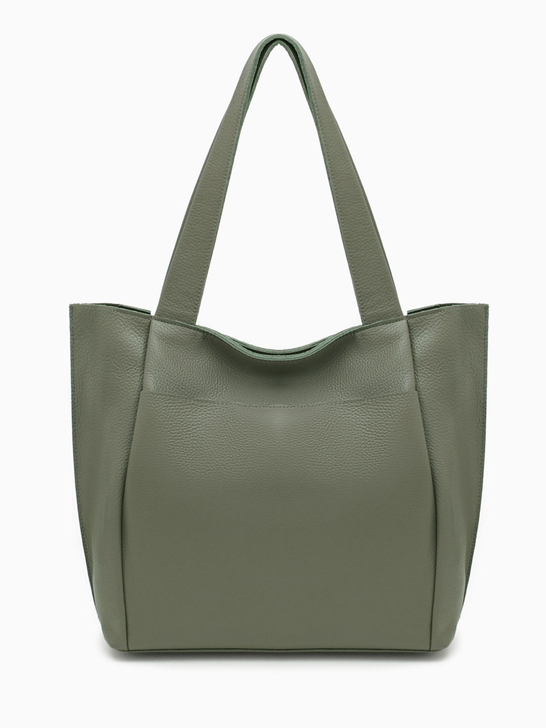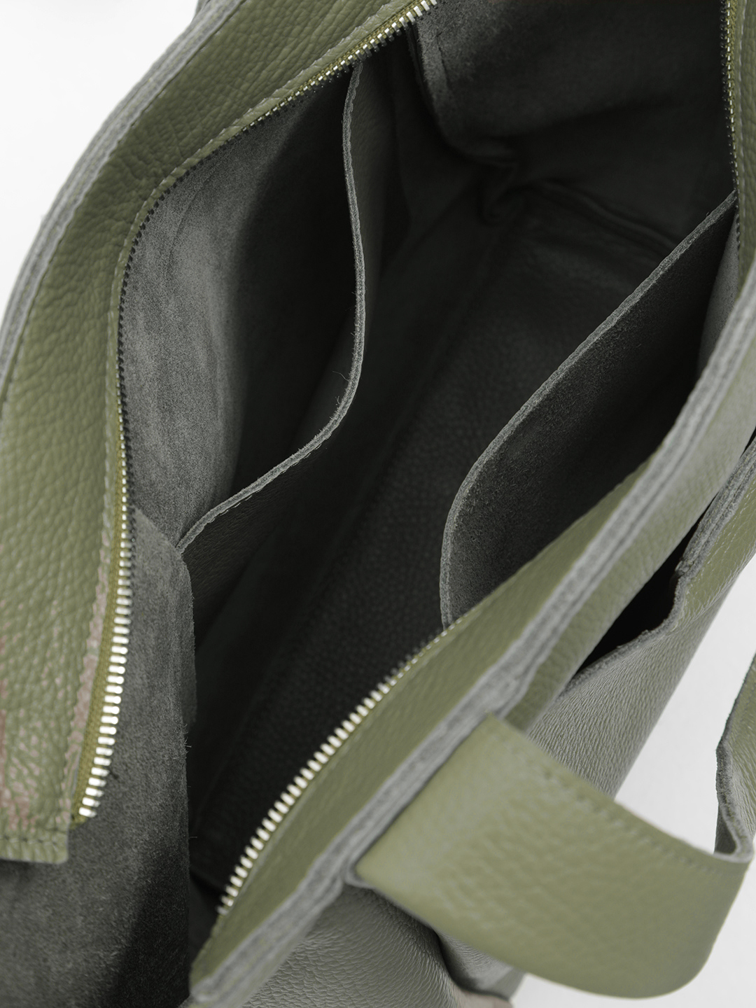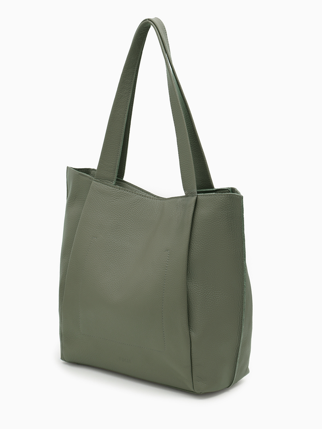 Объёмный шоппер из натуральной кожи с карманом на магните от FOLLE в зеленом цвете