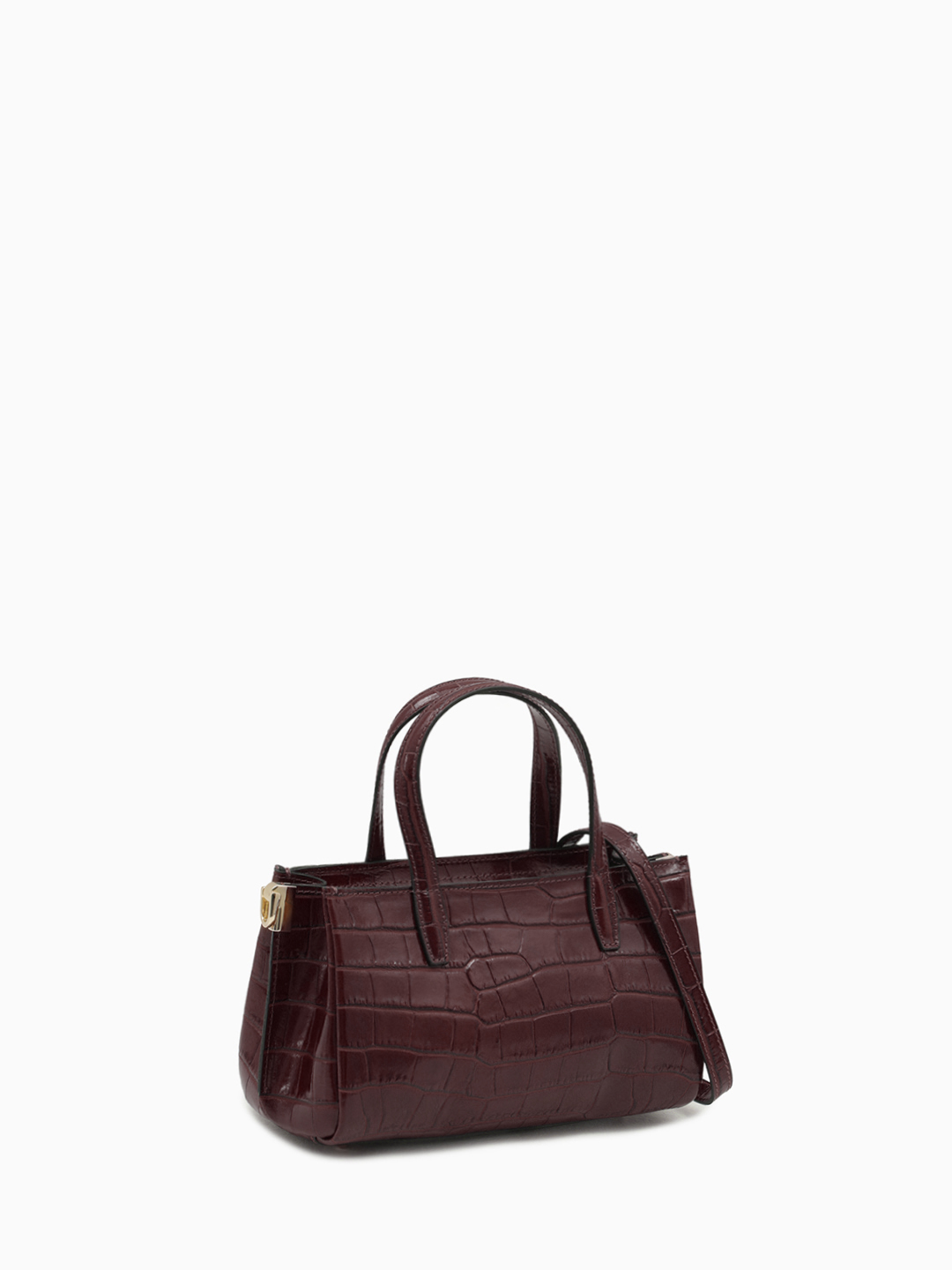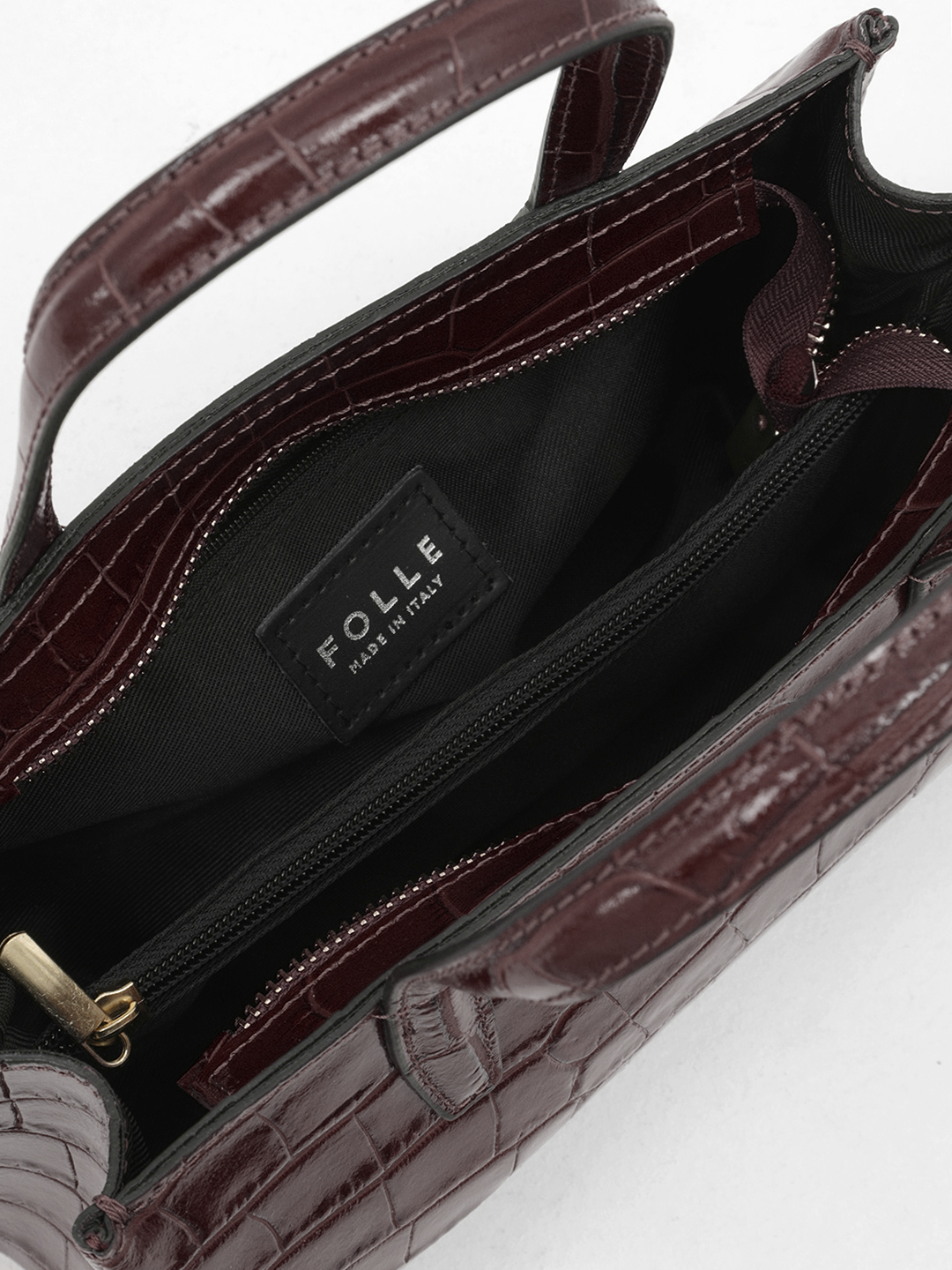 Небольшая сумка тоут через плечо от итальянского бренда FOLLE из натуральной кожи с выделкой под крокодила бордового цвета