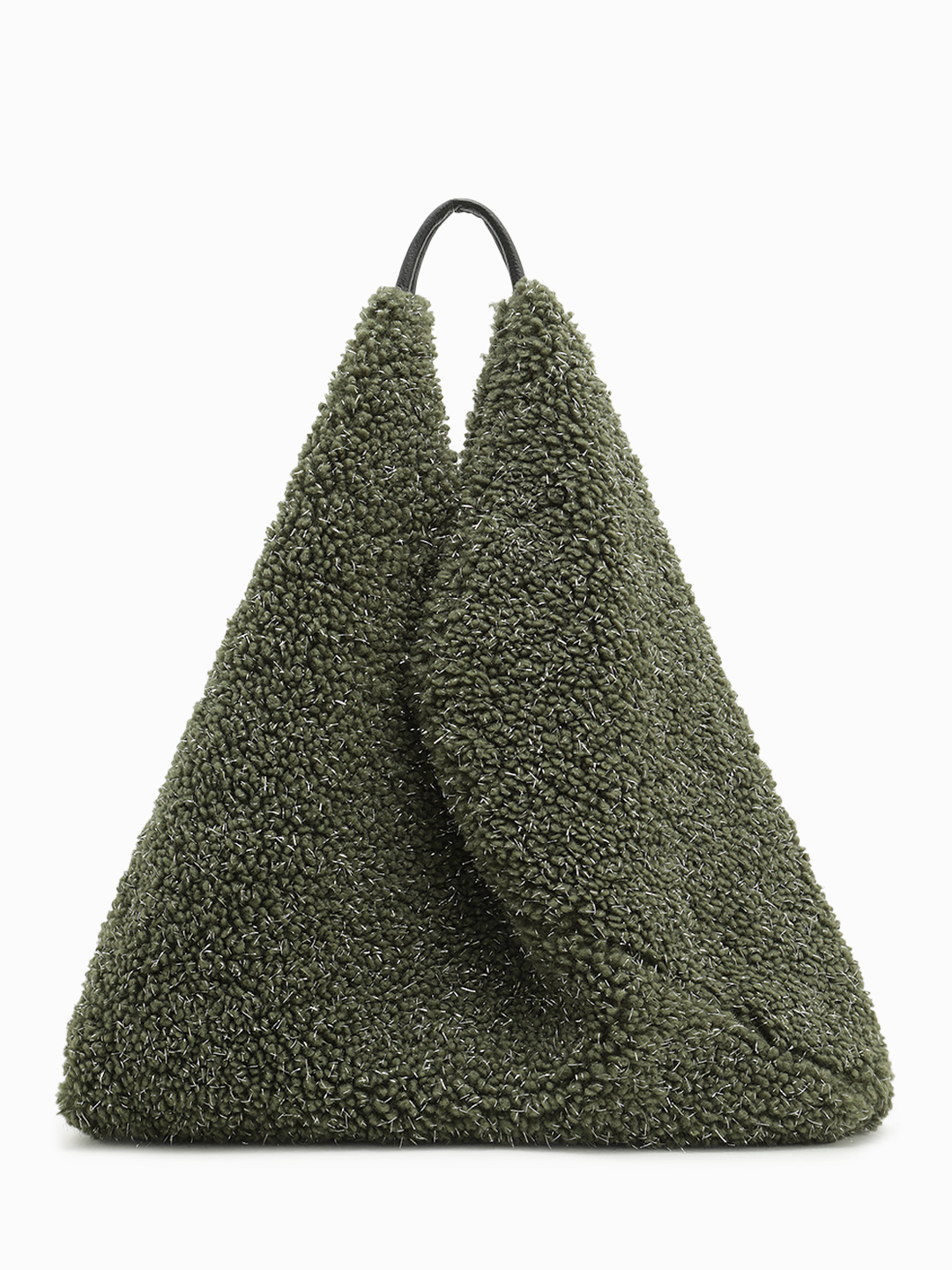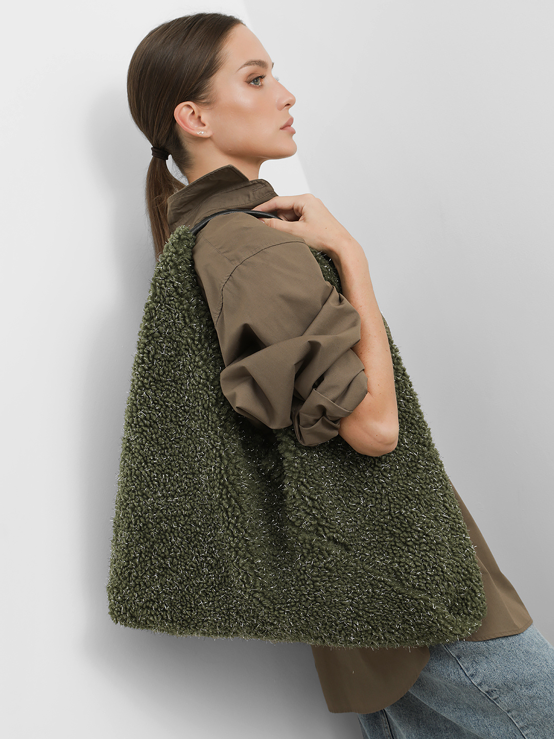 Мягкий шоппер из искусственного меха с серебристым люриксом в оливковом цвете