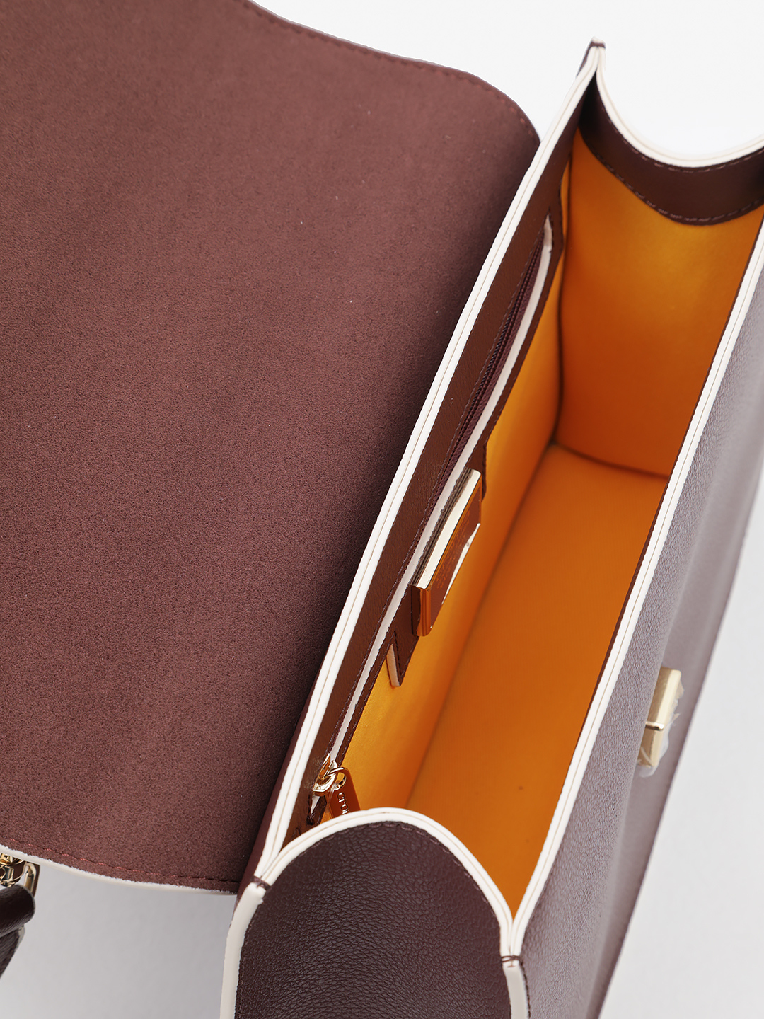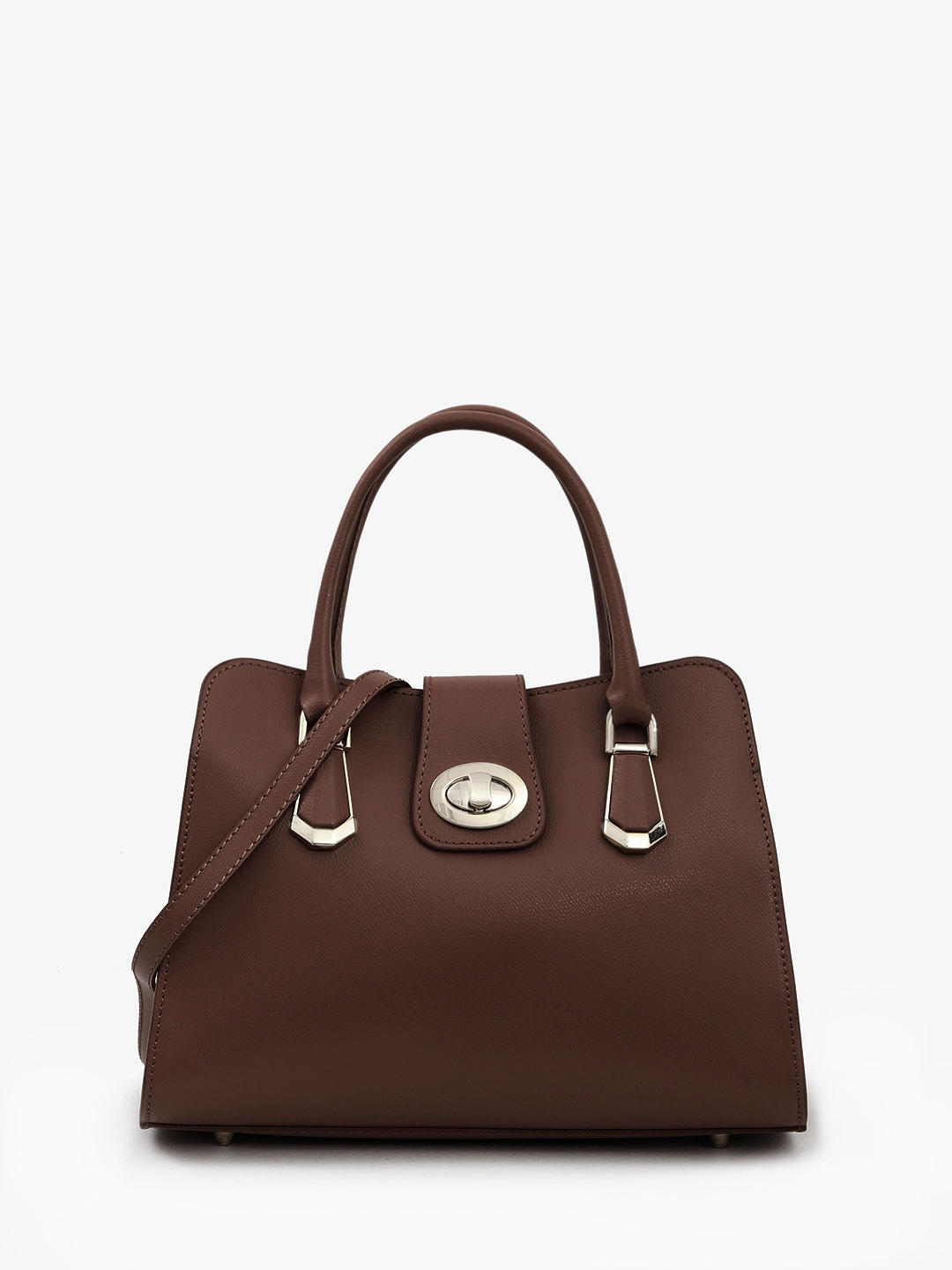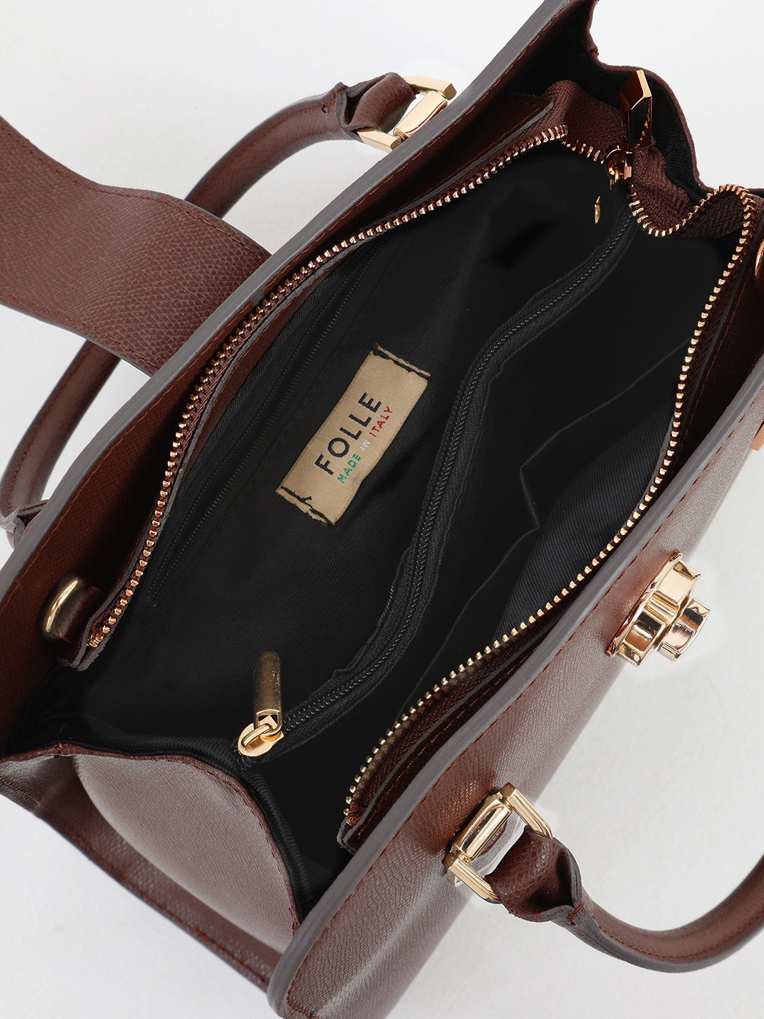Сумка-тоут с поворотной золотистой фурнитурой от FOLLE в коричневом цвете