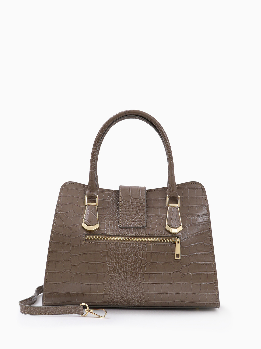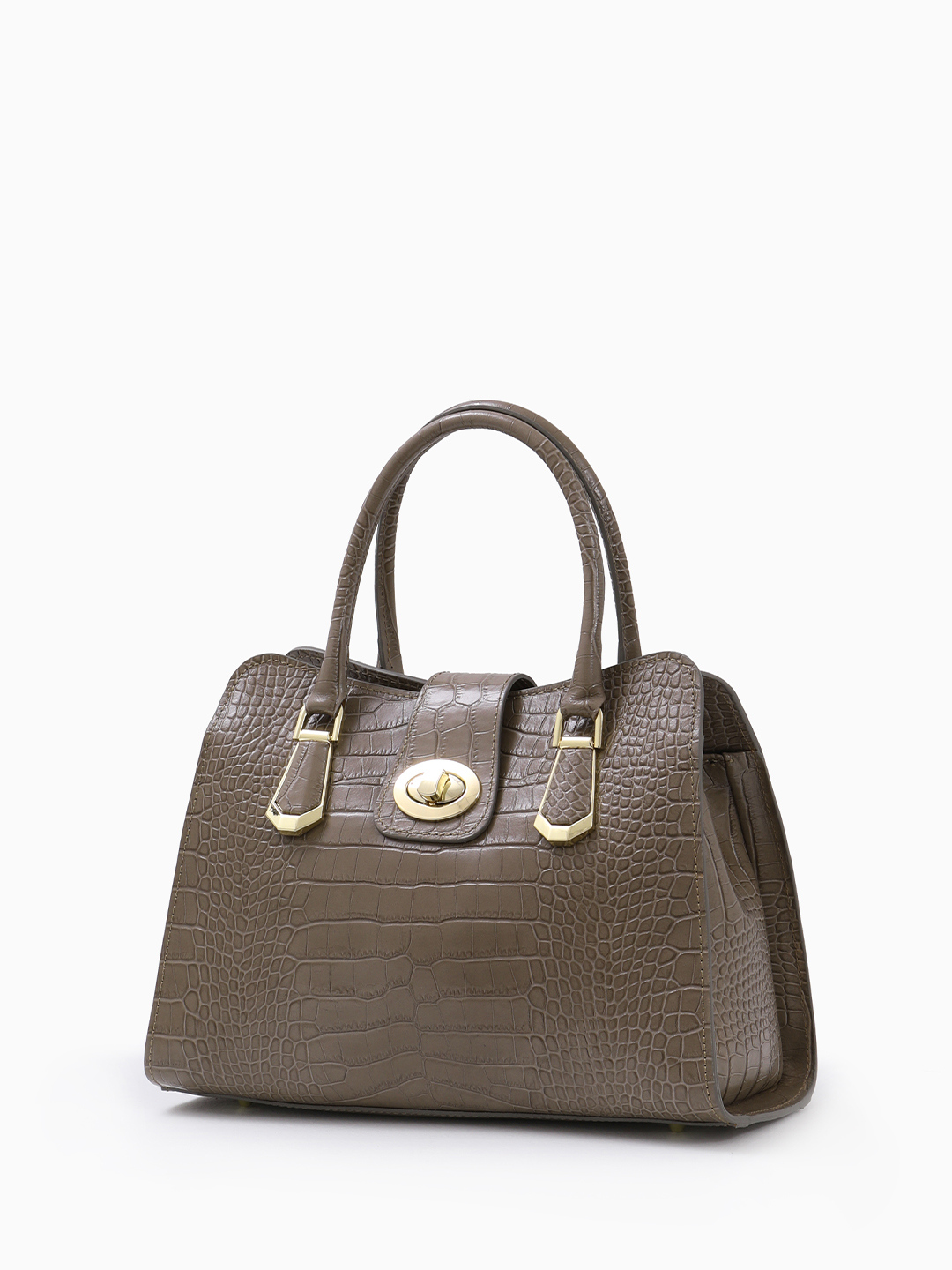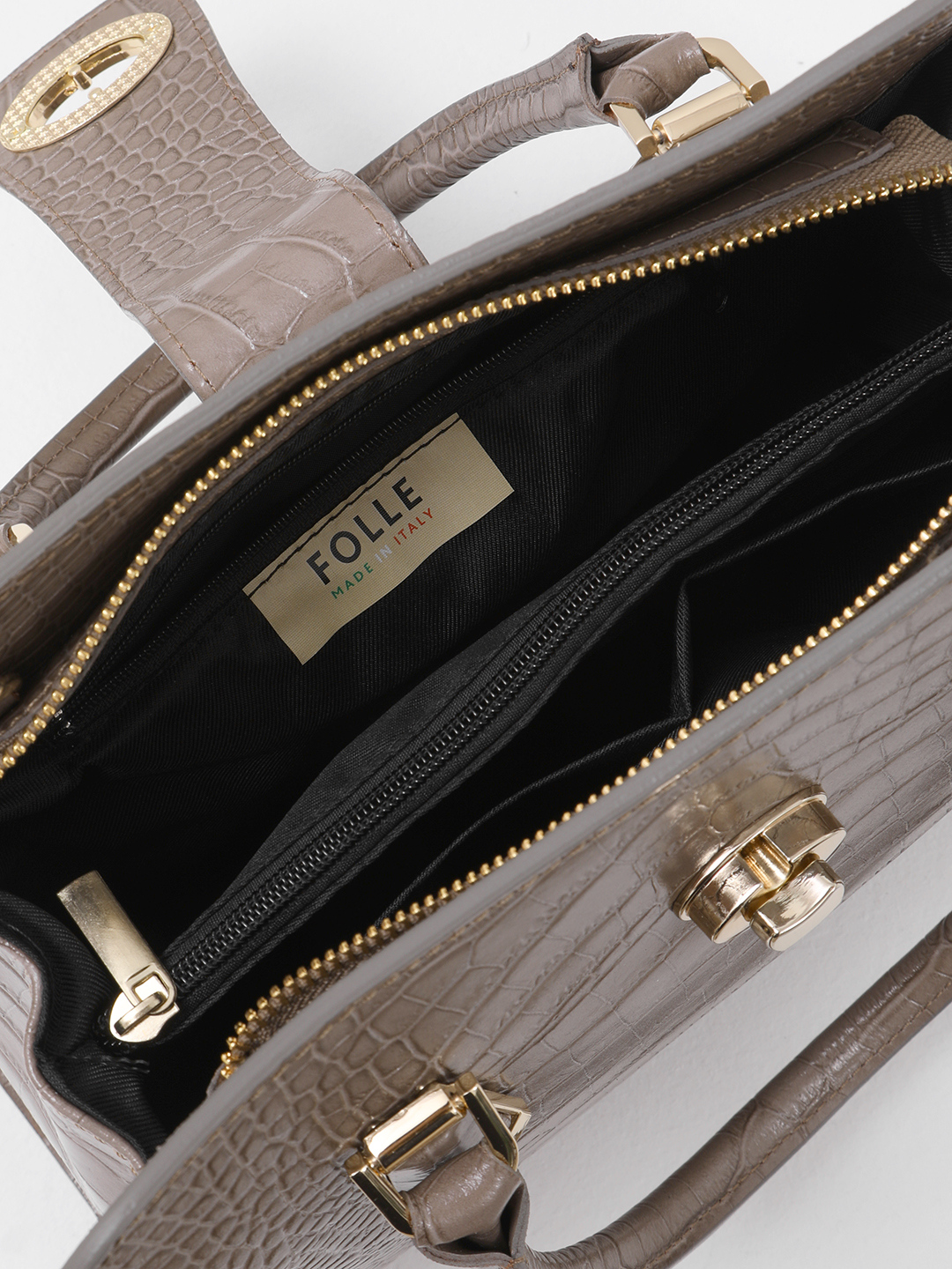 Сумка-тоут с поворотной золотистой фурнитурой в коже под крокодила от FOLLE в цвете тауп