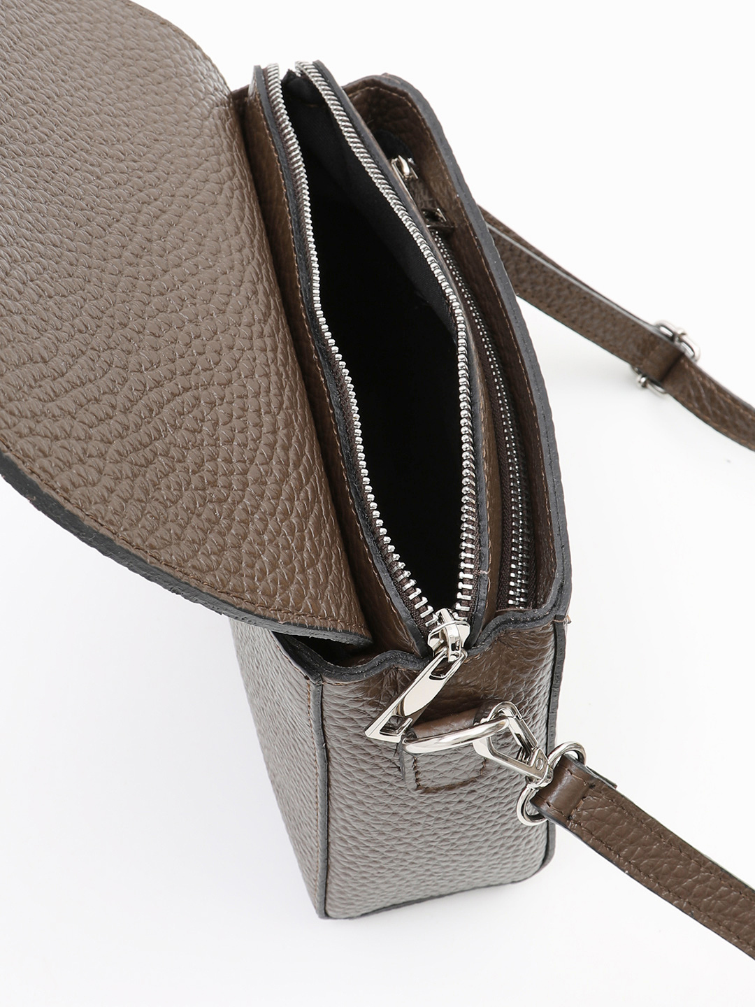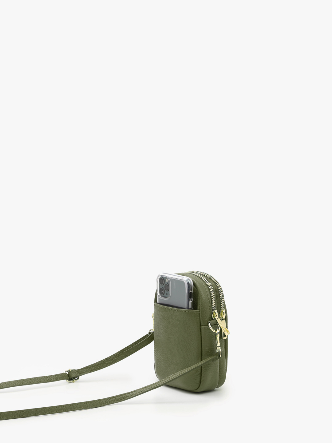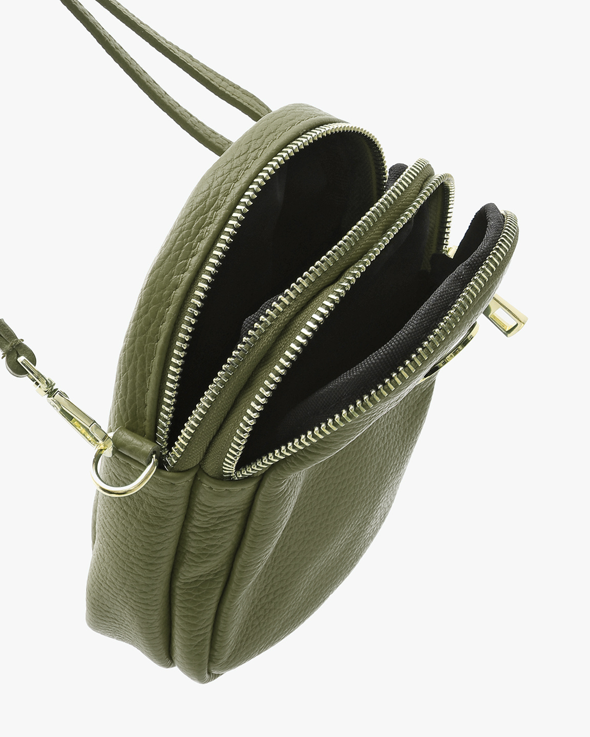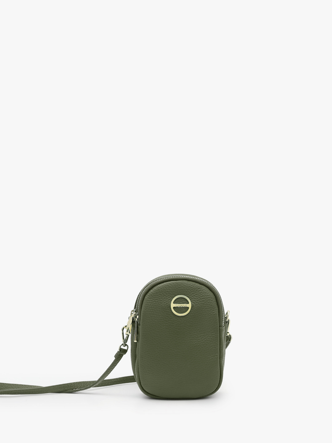 Сумка для телефона из натуральной кожи в оливковом цвете с круглой фирменной фурнитурой от FOLLE