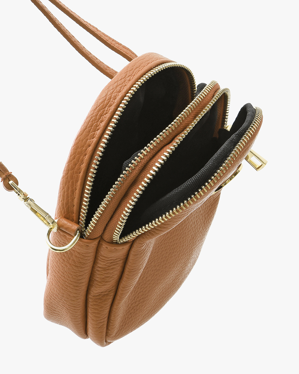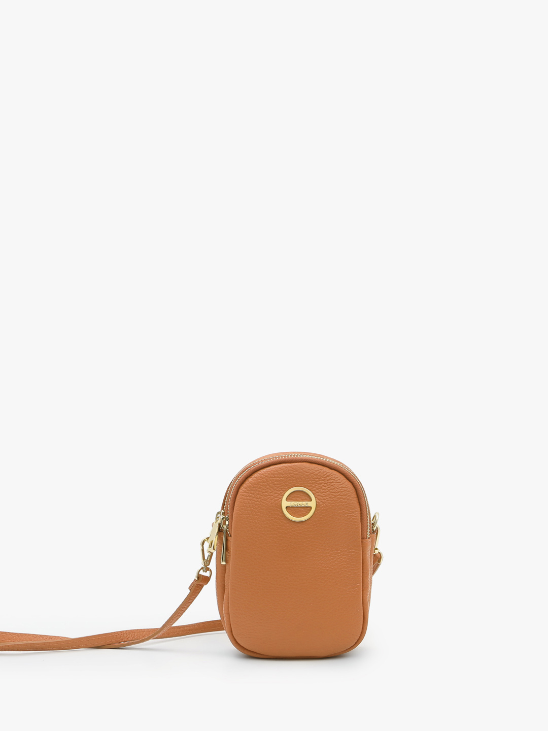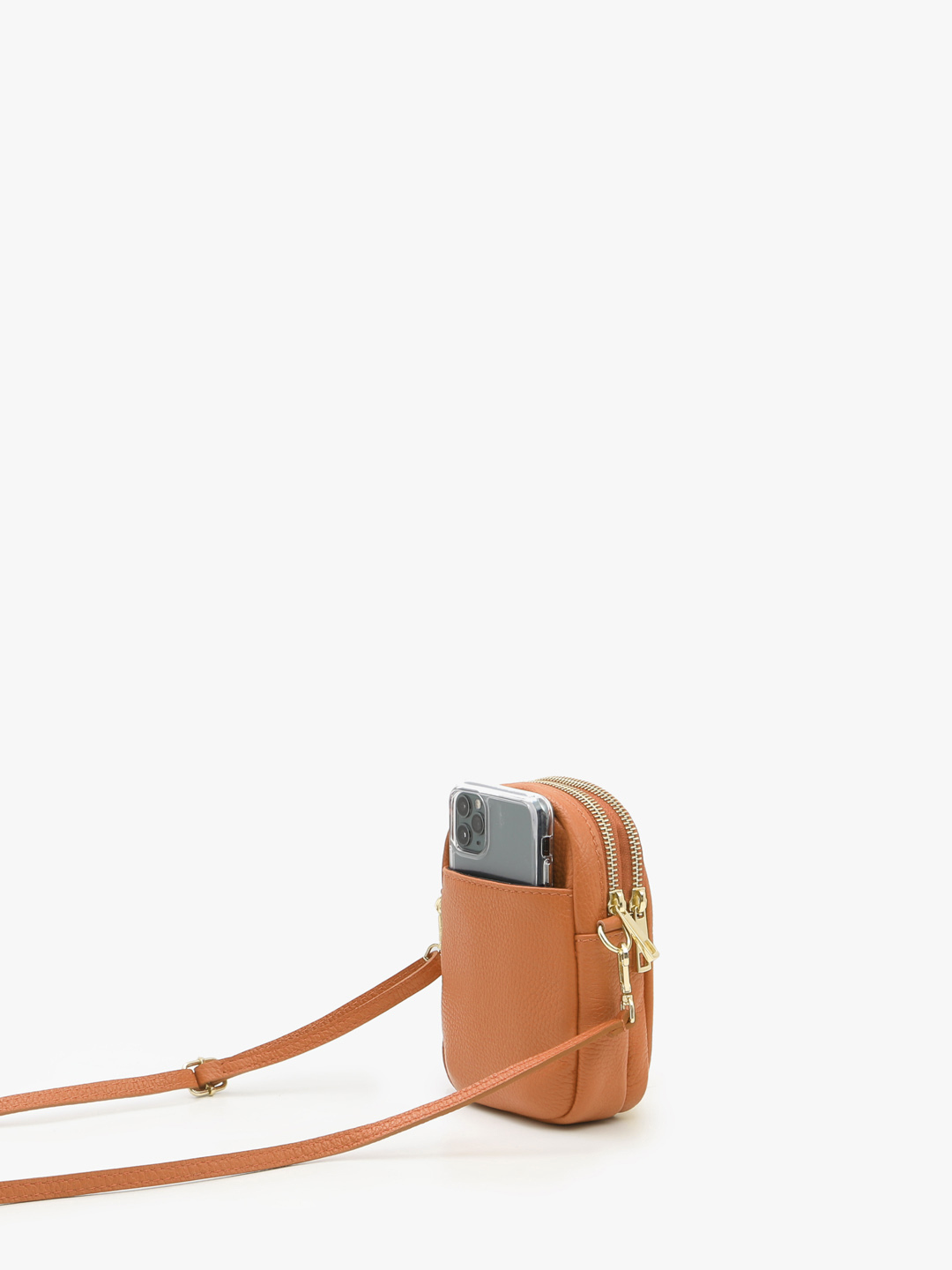 Сумка для телефона из натуральной кожи в рыжем цвете с круглой фирменной фурнитурой от FOLLE