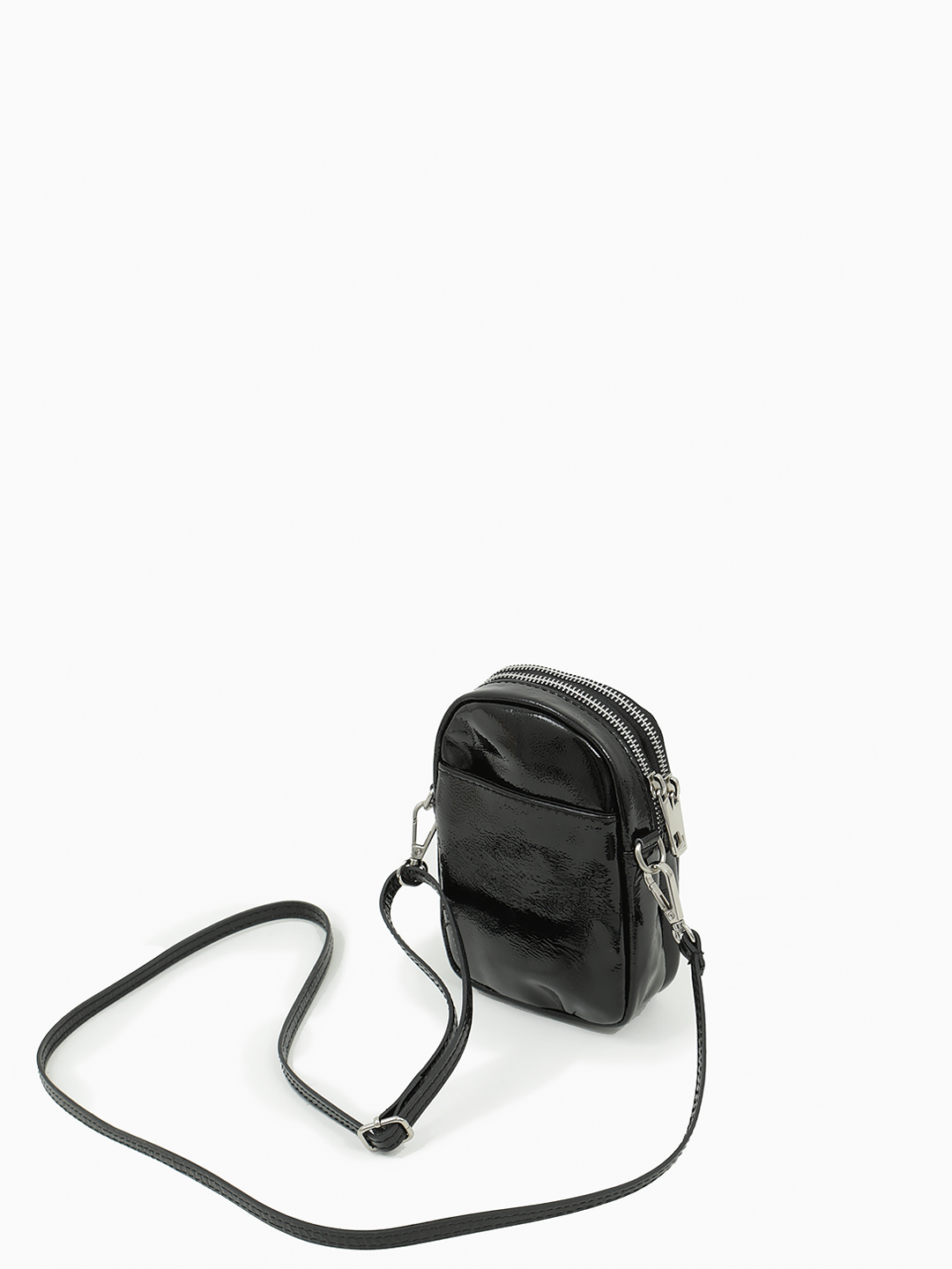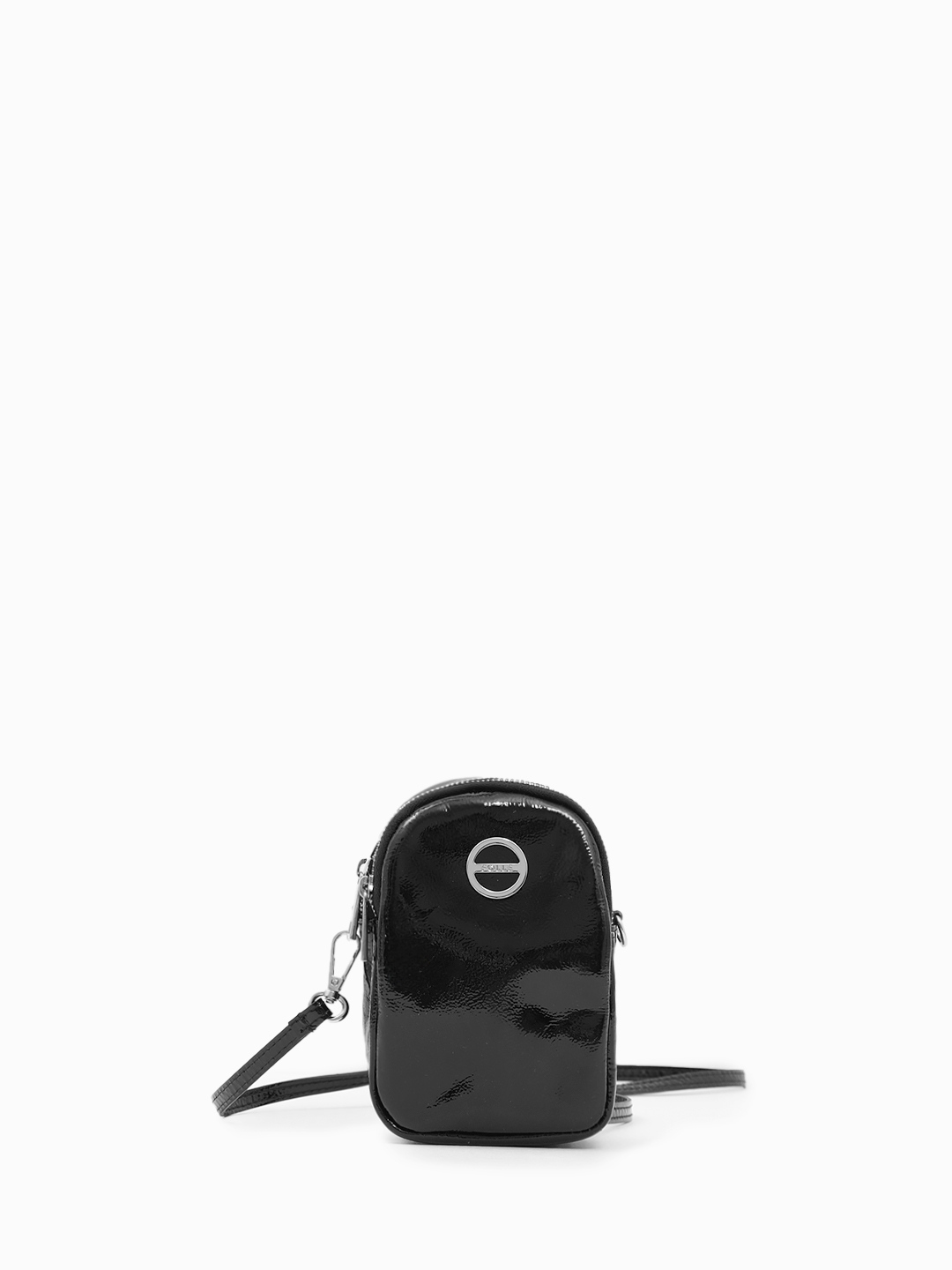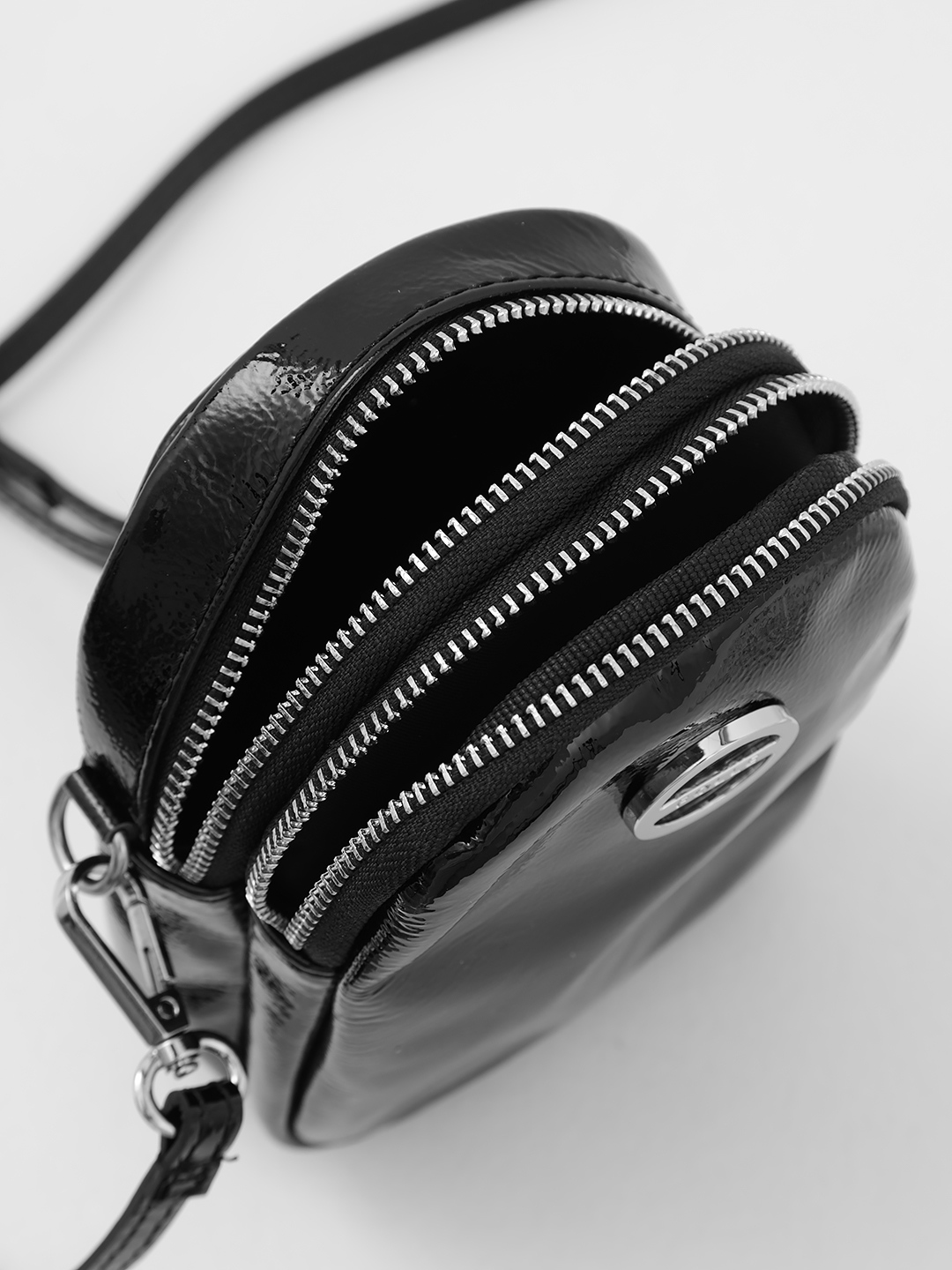 Сумка для телефона из натуральной лаковой кожи чёрного цвета с круглой фирменной фурнитурой от FOLLE