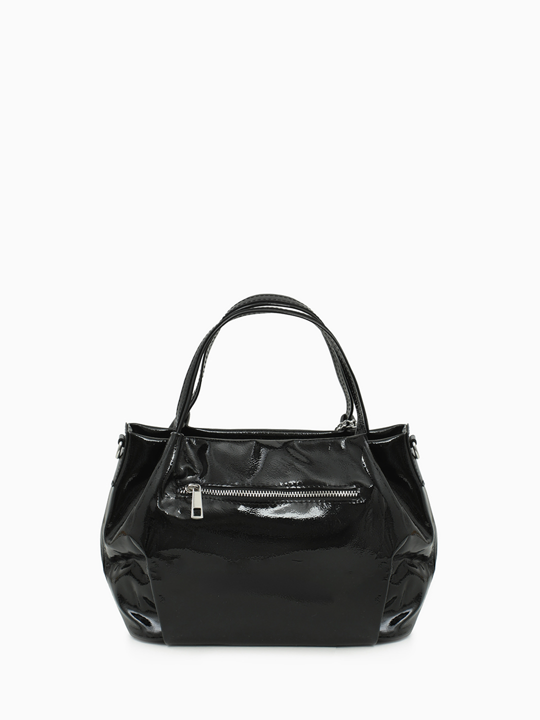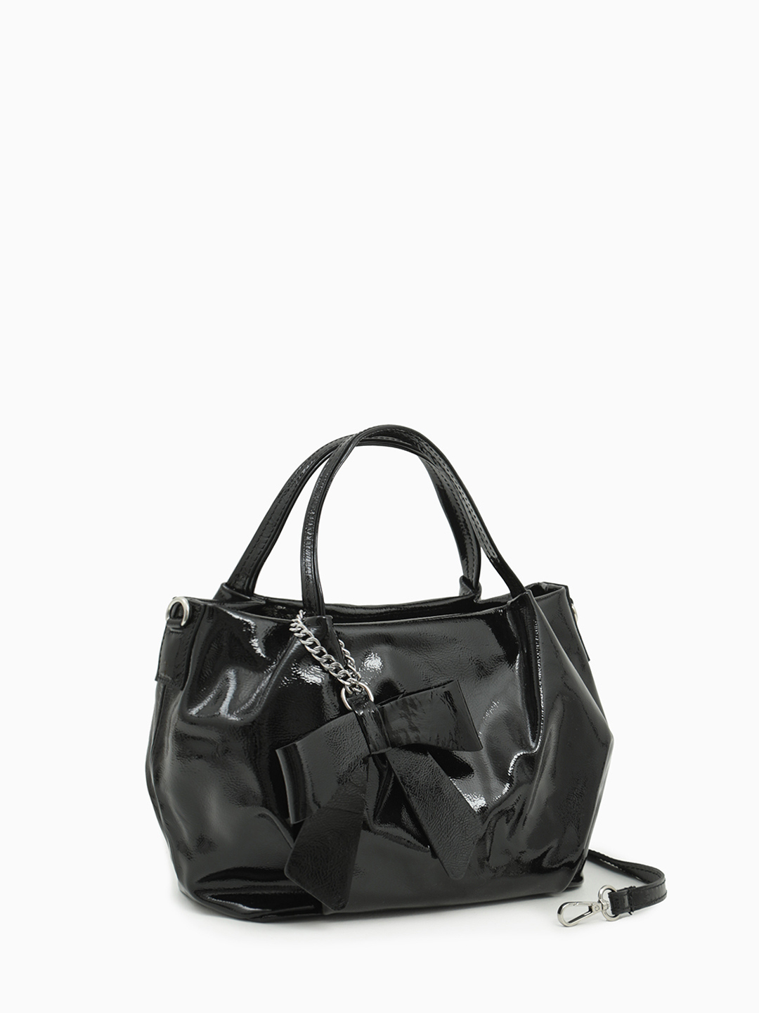 Тоут с брелком-бантом из натуральной лаковой кожи от FOLLE в чёрном цвете
